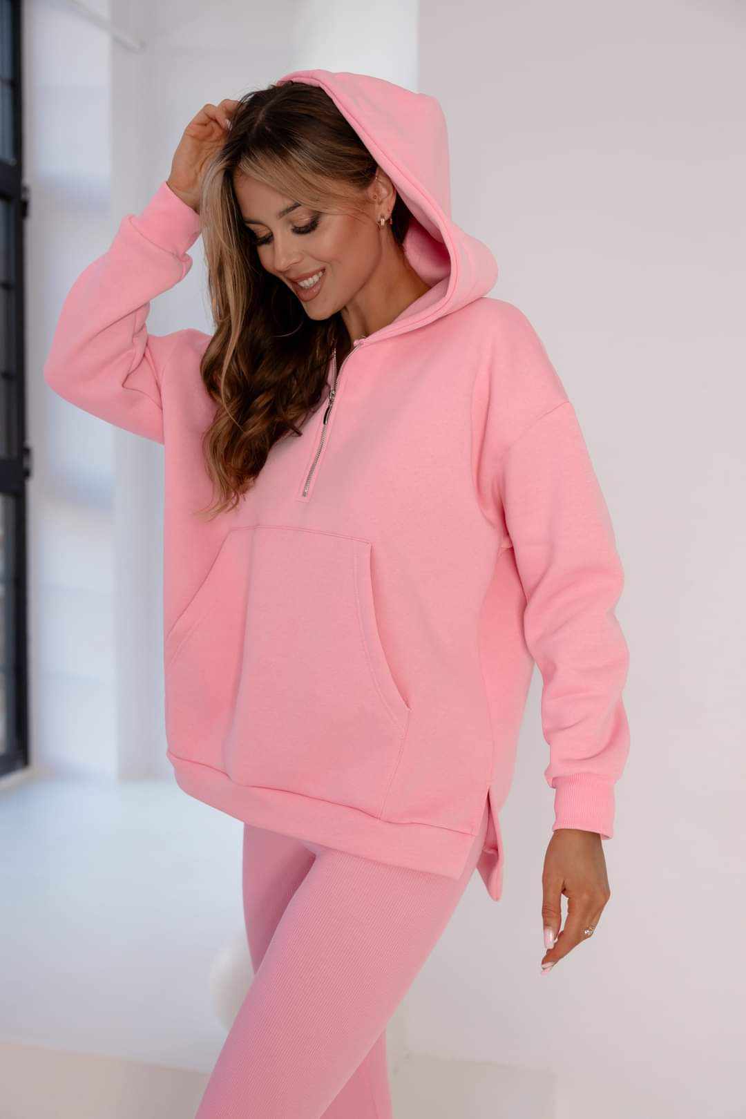Dres w odcieniu różowym z legginsami i bluzą oversize to stylowy zestaw, który charakteryzuje się kilkoma cechami: