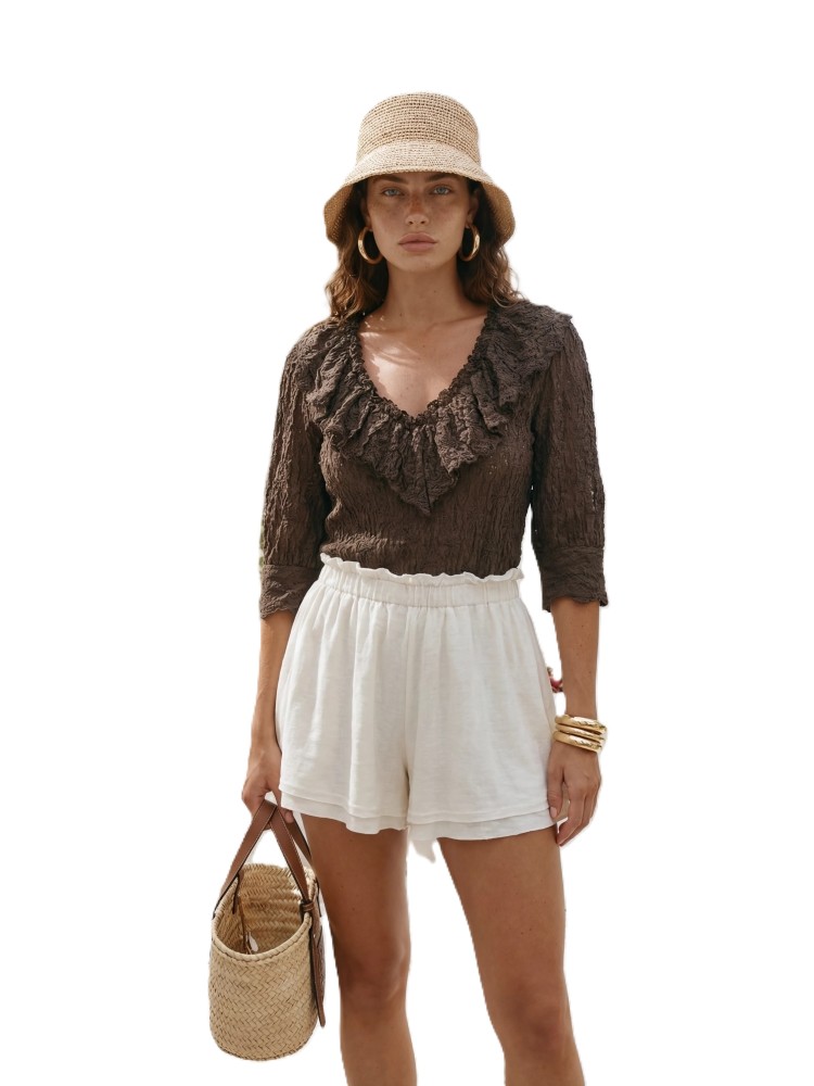 Bluzka Damska Boho brązowa z Falbaną Dekolt V Rękaw 3/4
