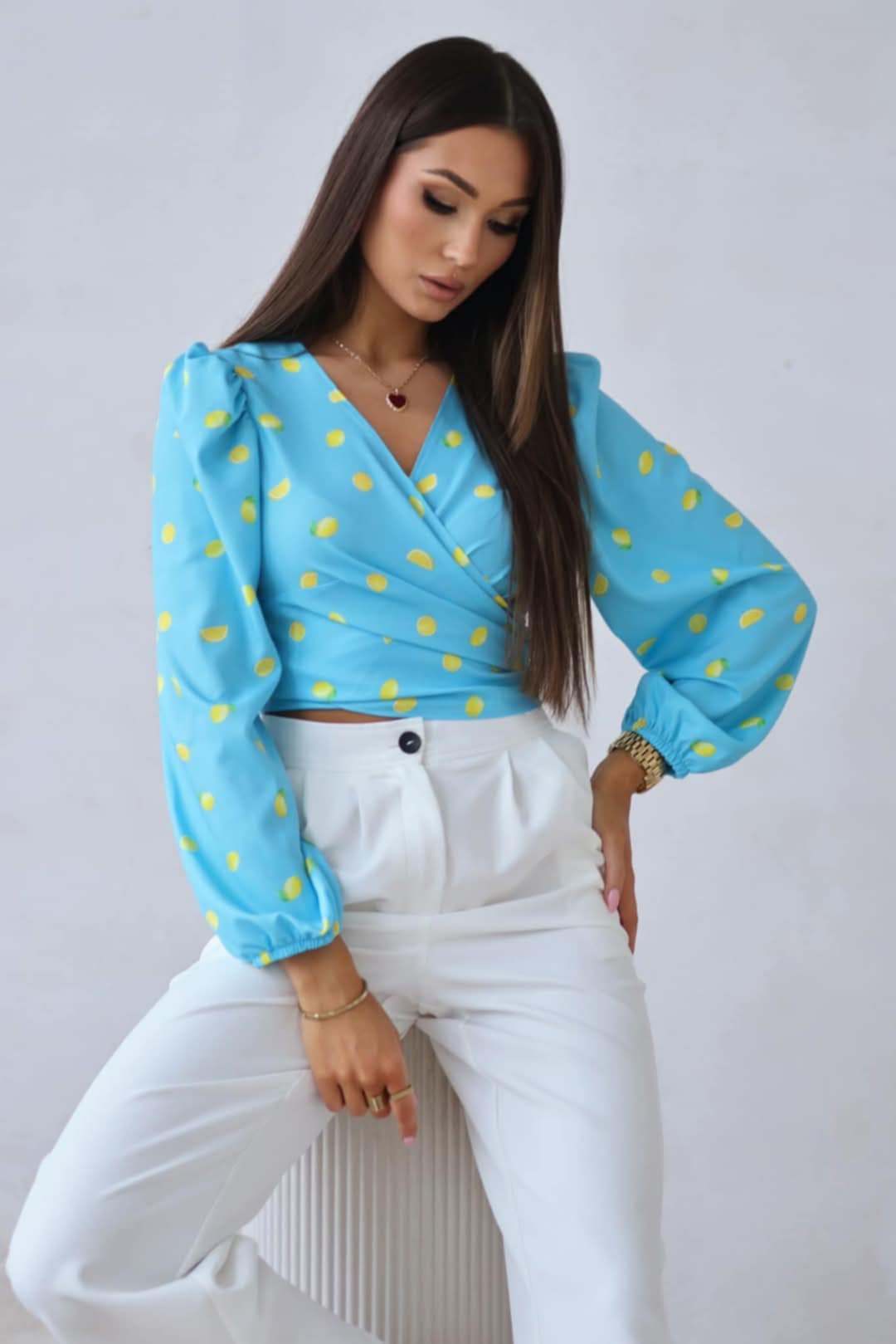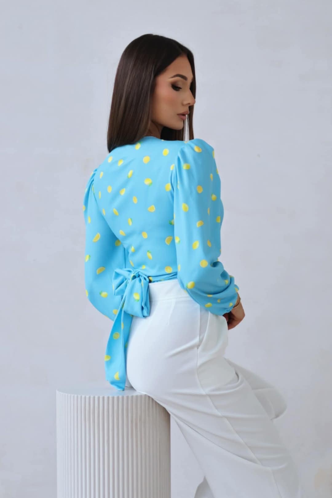 Bluzka damska kopertowa Sanah-niebieska wzór cytryny