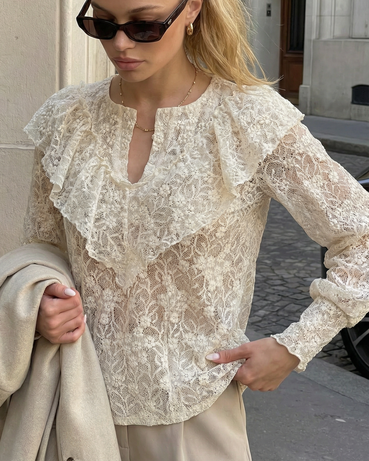 Delikatna koronka nadaje bluzce romantycznego i luksusowego charakteru.