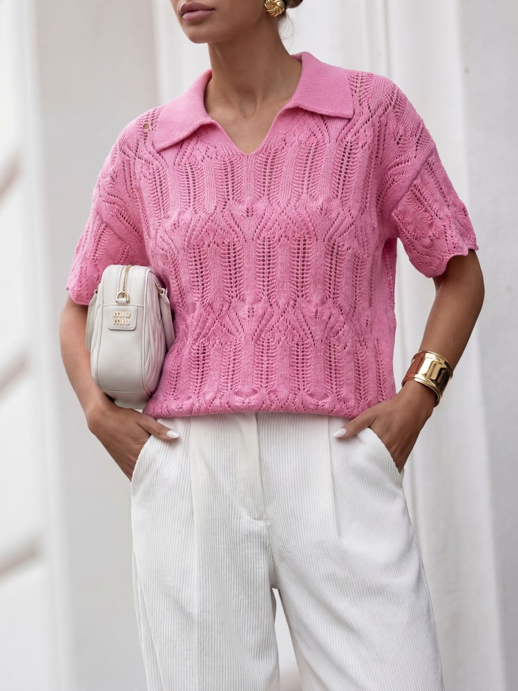 Bluzka damska polo różowa Bella rosa ażurowa z kołnierzem Cocomore