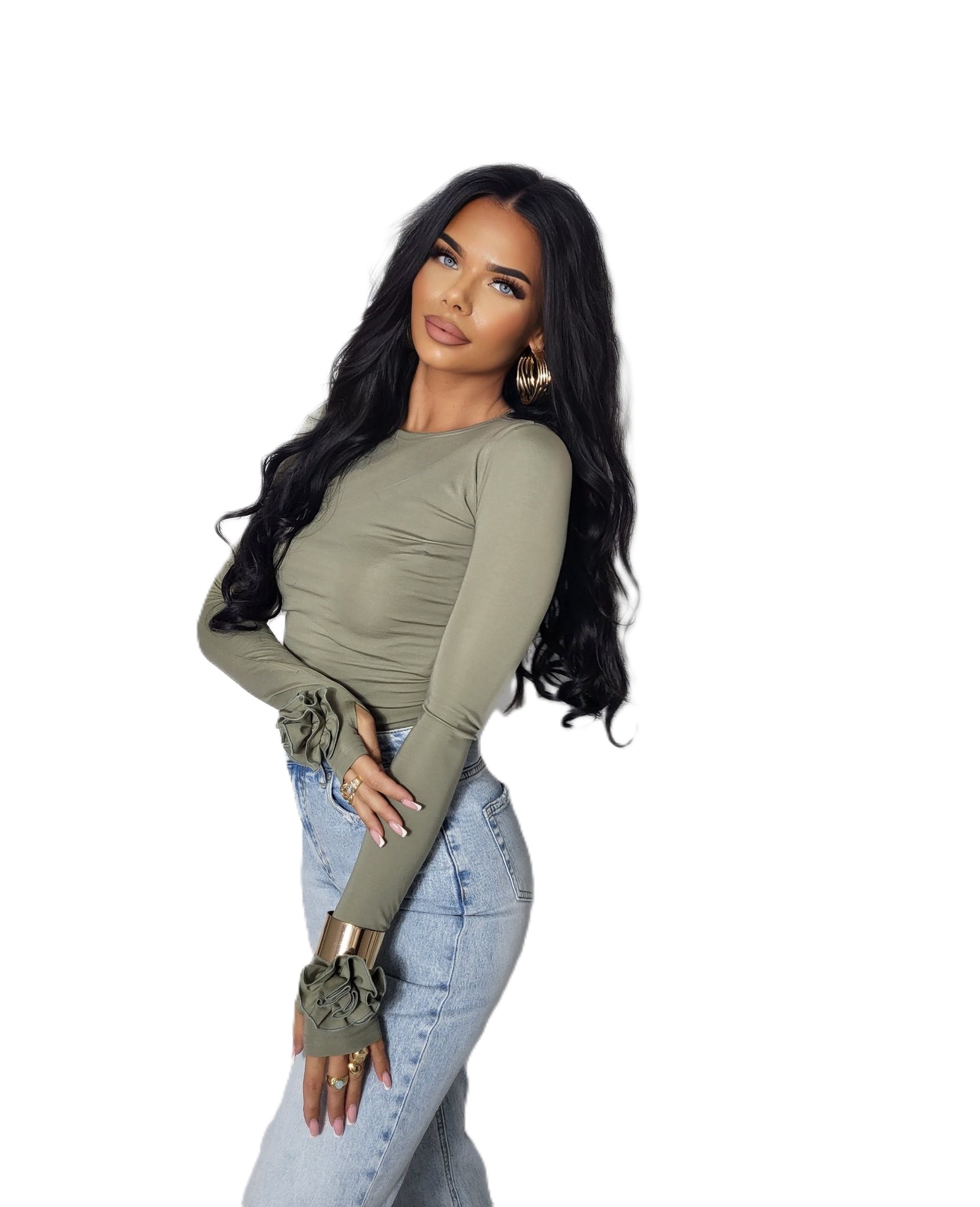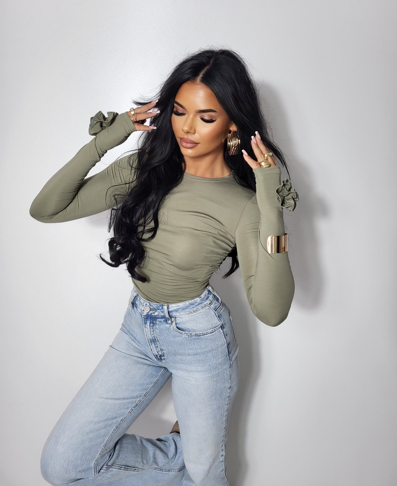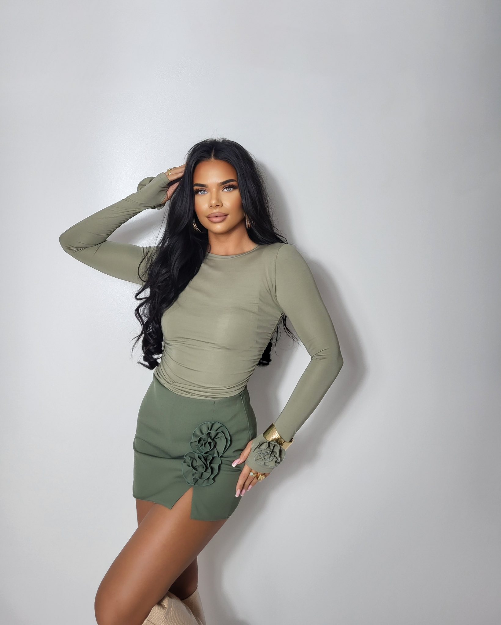 Bluzka damska z długim rękawem i różą khaki wiskoza
