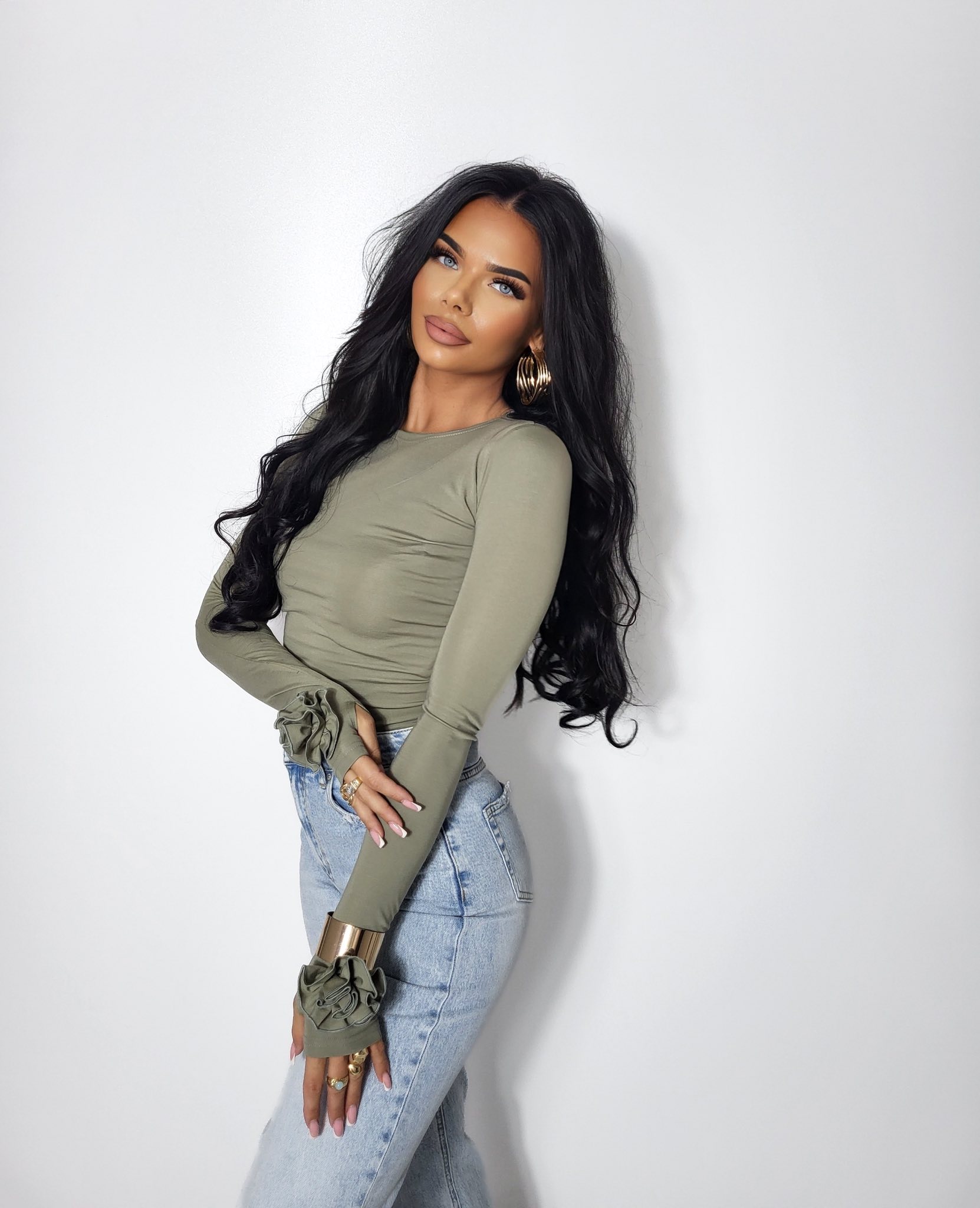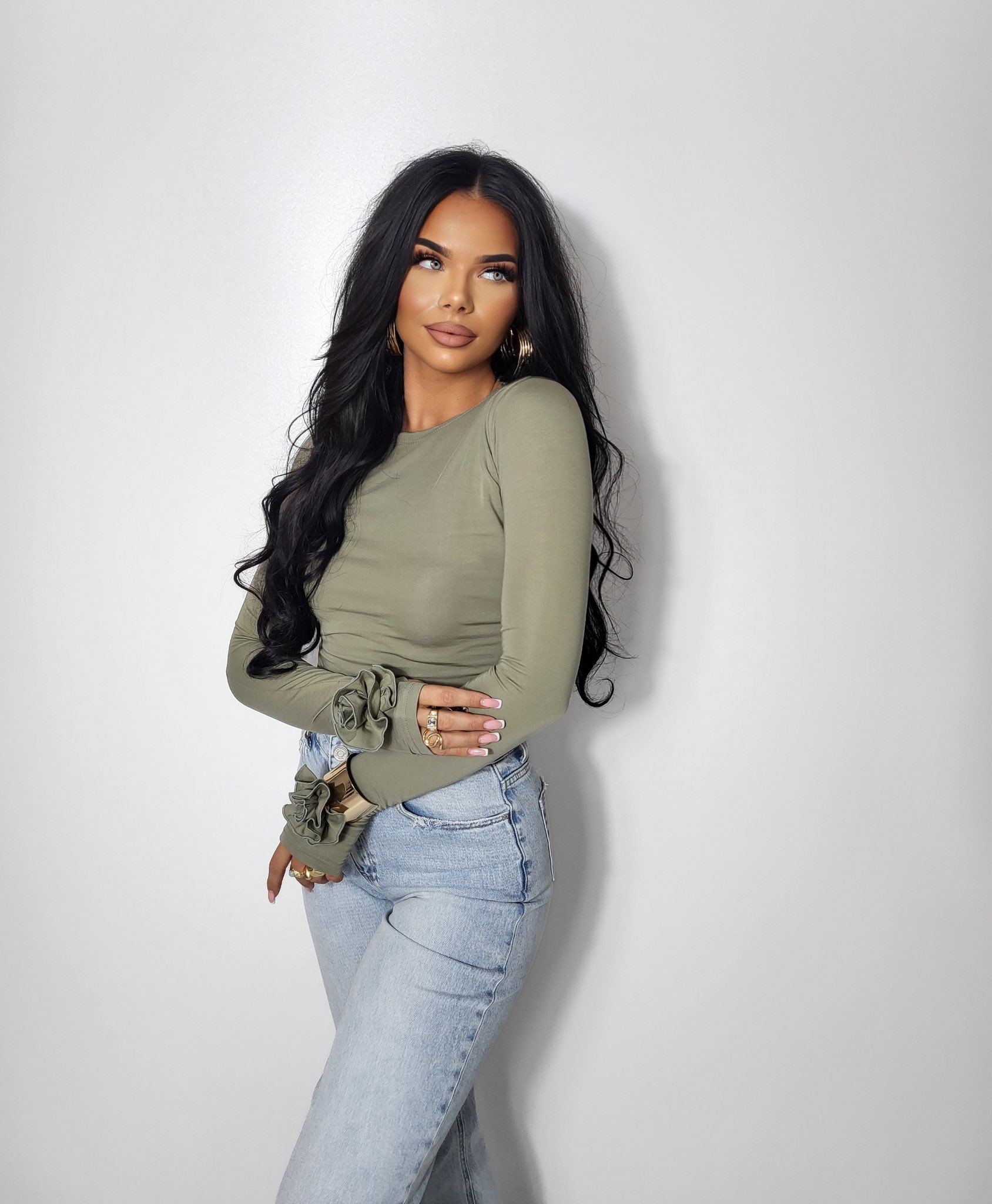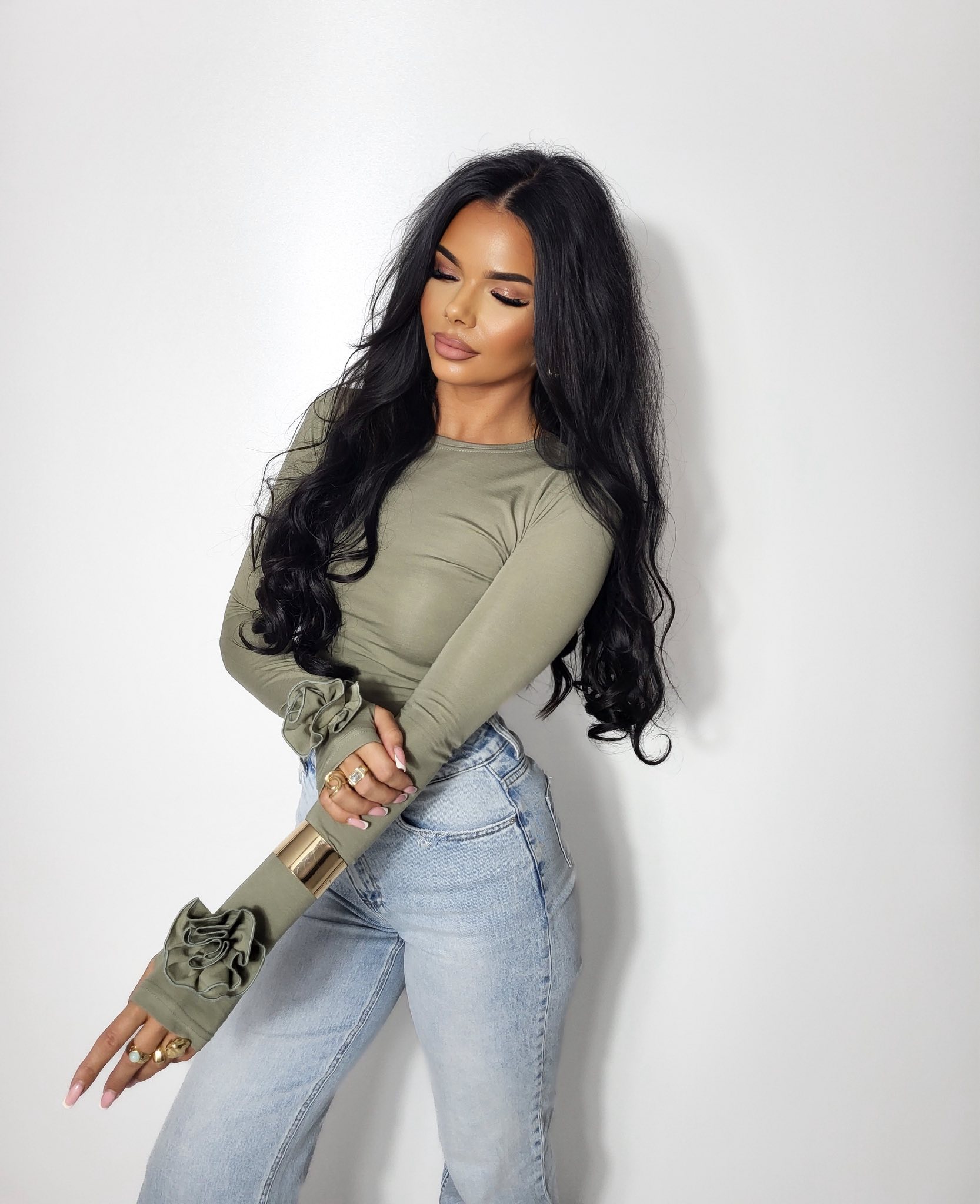 Bluzka damska z długim rękawem i różą khaki wiskoza