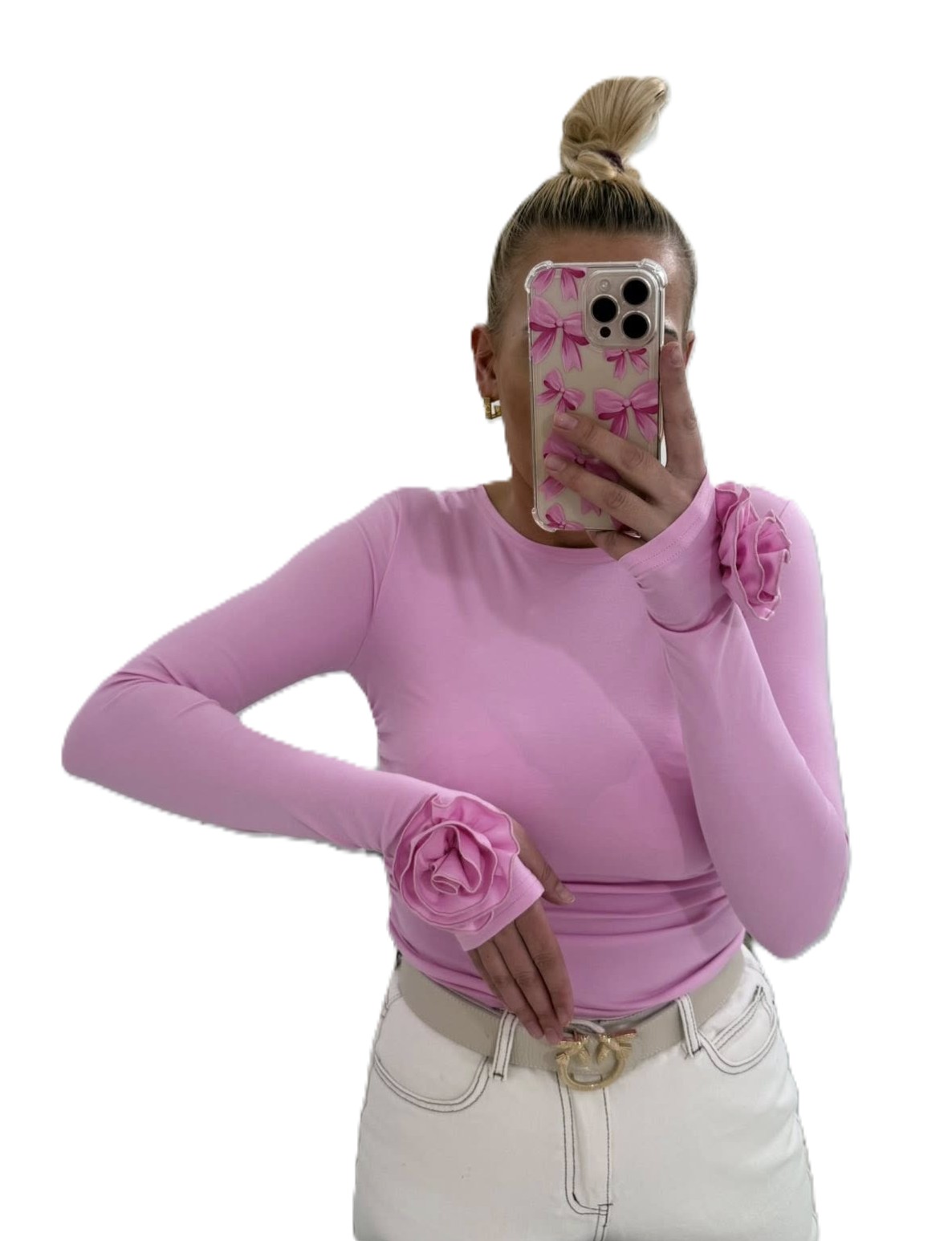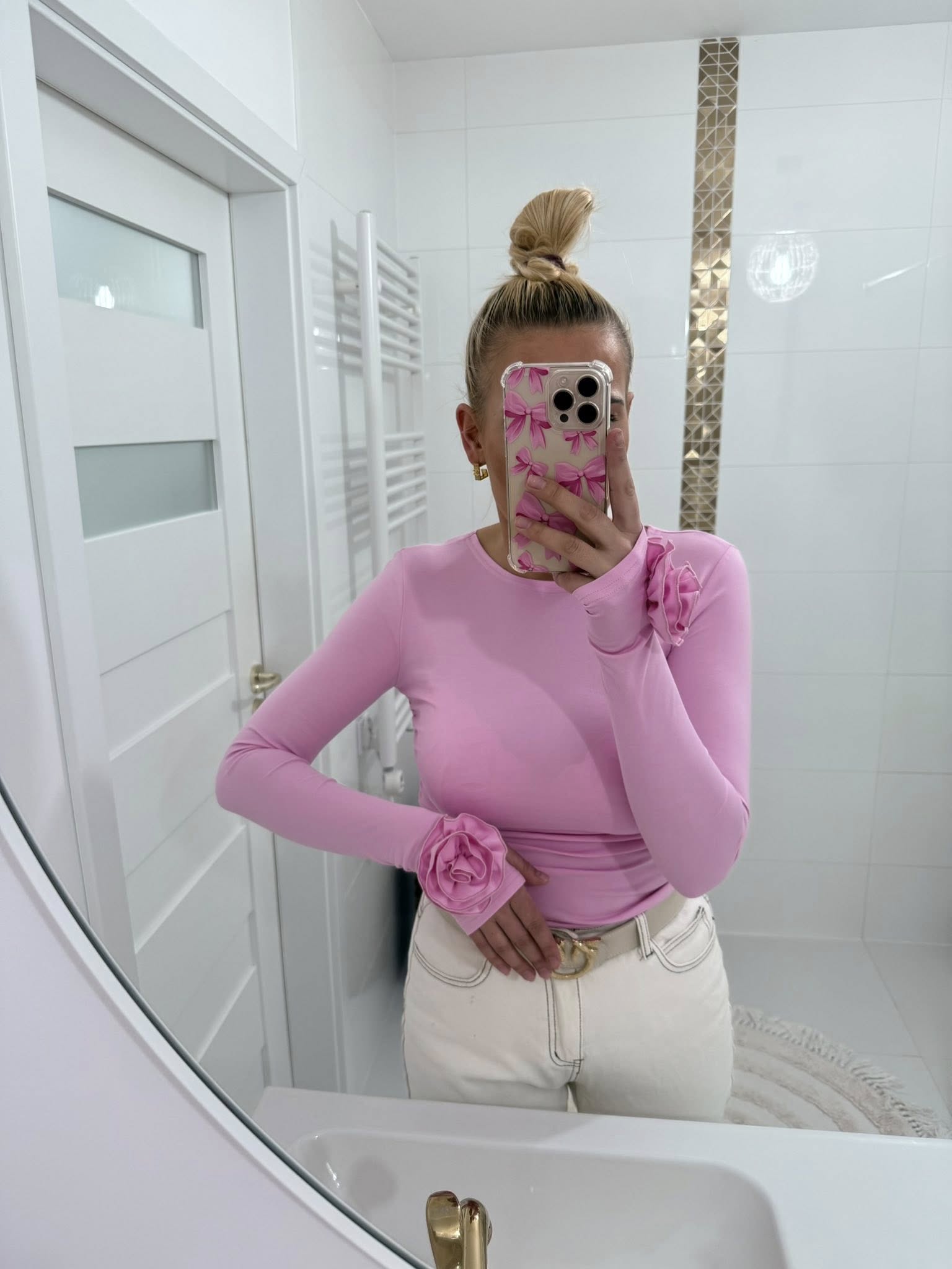 Bluzka damska z długim rękawem i różą pastelowy róż