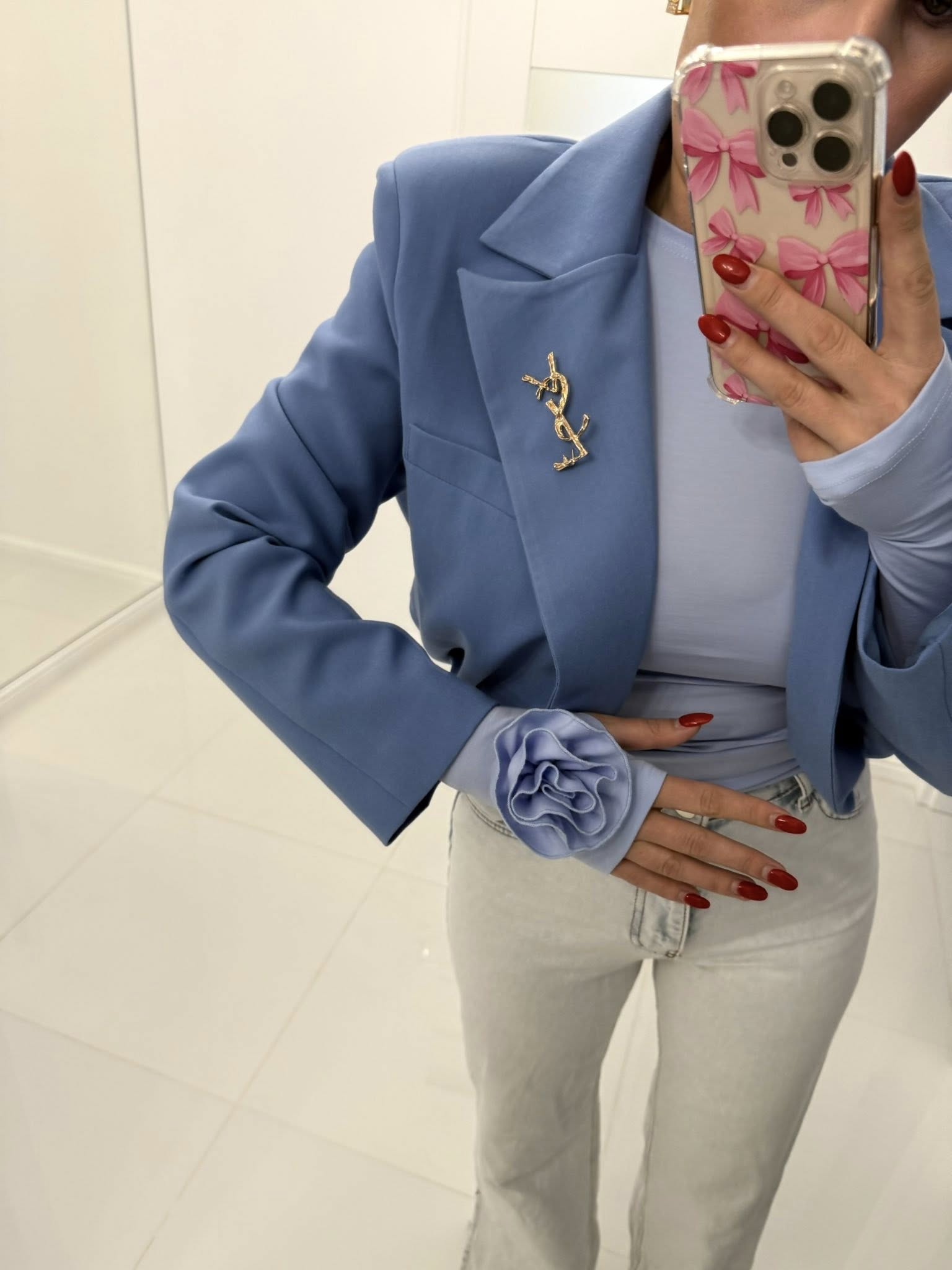 Bomberka damska krótki żakiet jeans niebieski z broszką