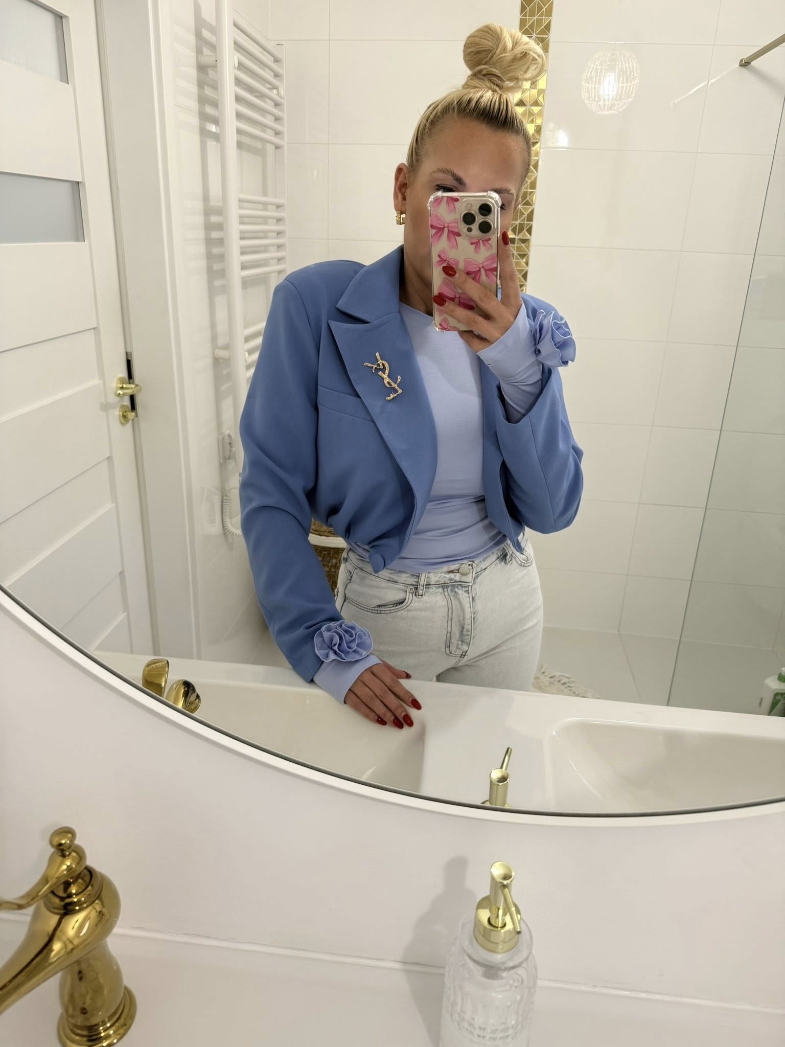 Stylowa bomberka damska w kolorze jeansowego niebieskiego, która łączy elegancję marynarki z nowoczesnym, modowym charakterem.
