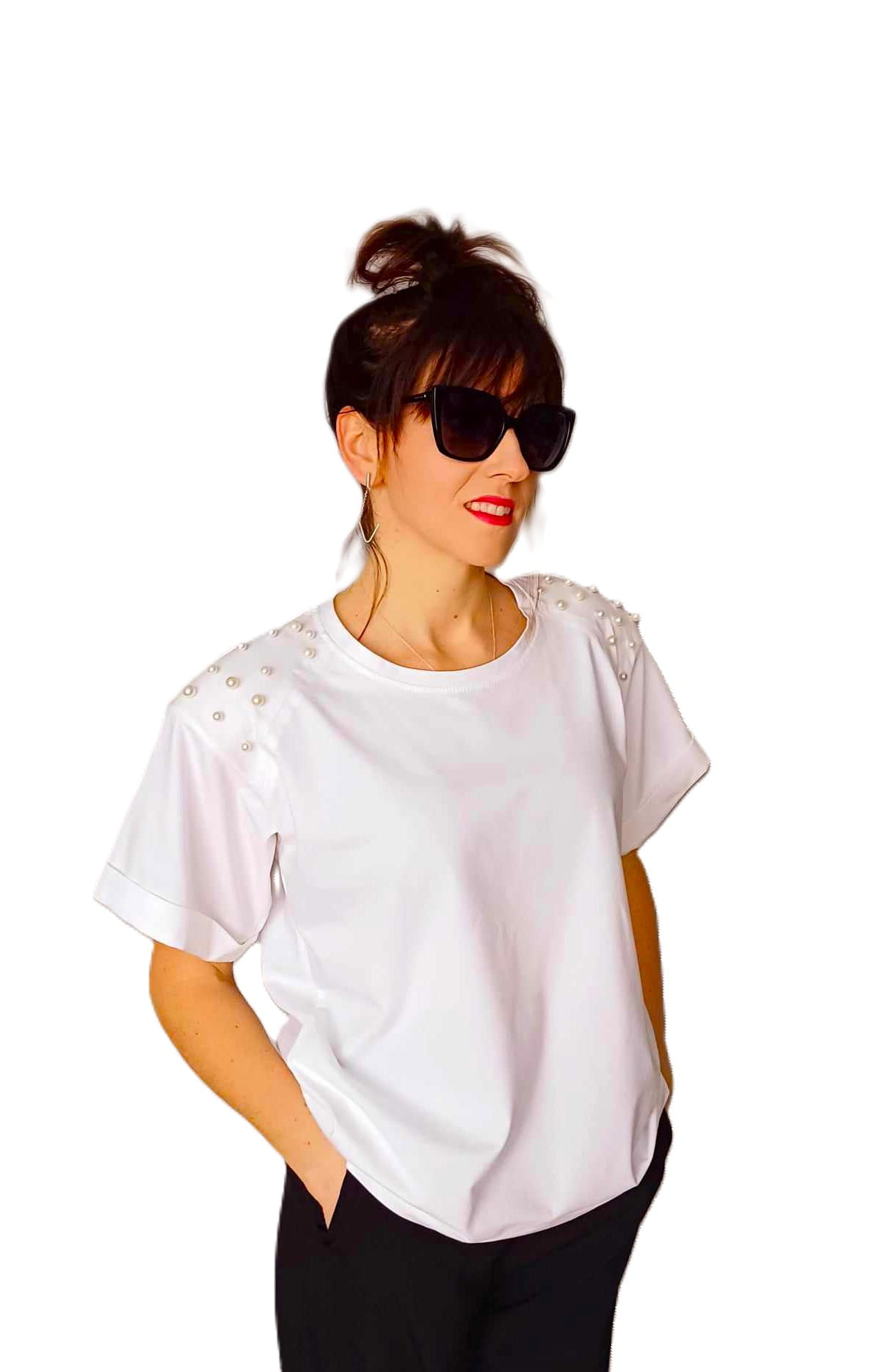Bluzka z perłami na ramionach i poduszkami to elegancka i stylowa opcja dla miłośniczek mody.