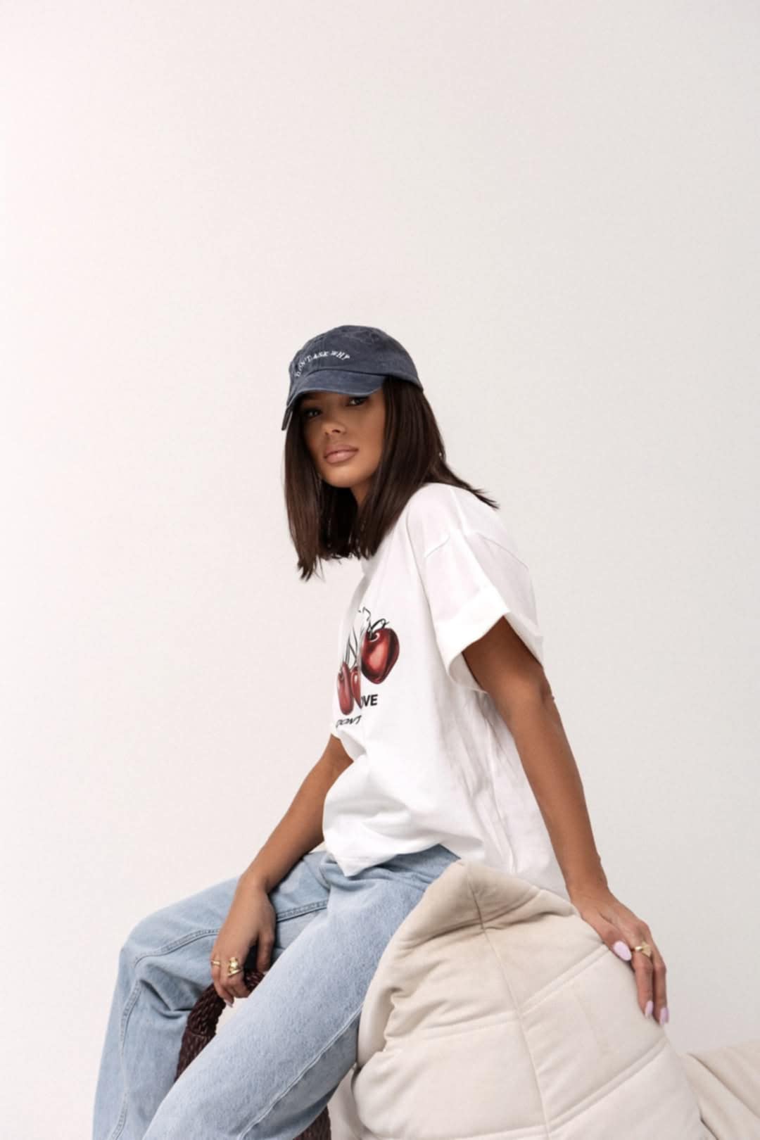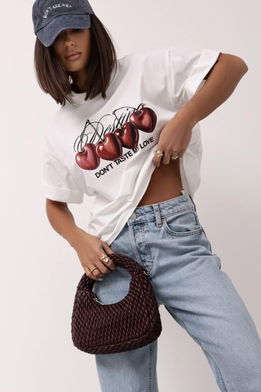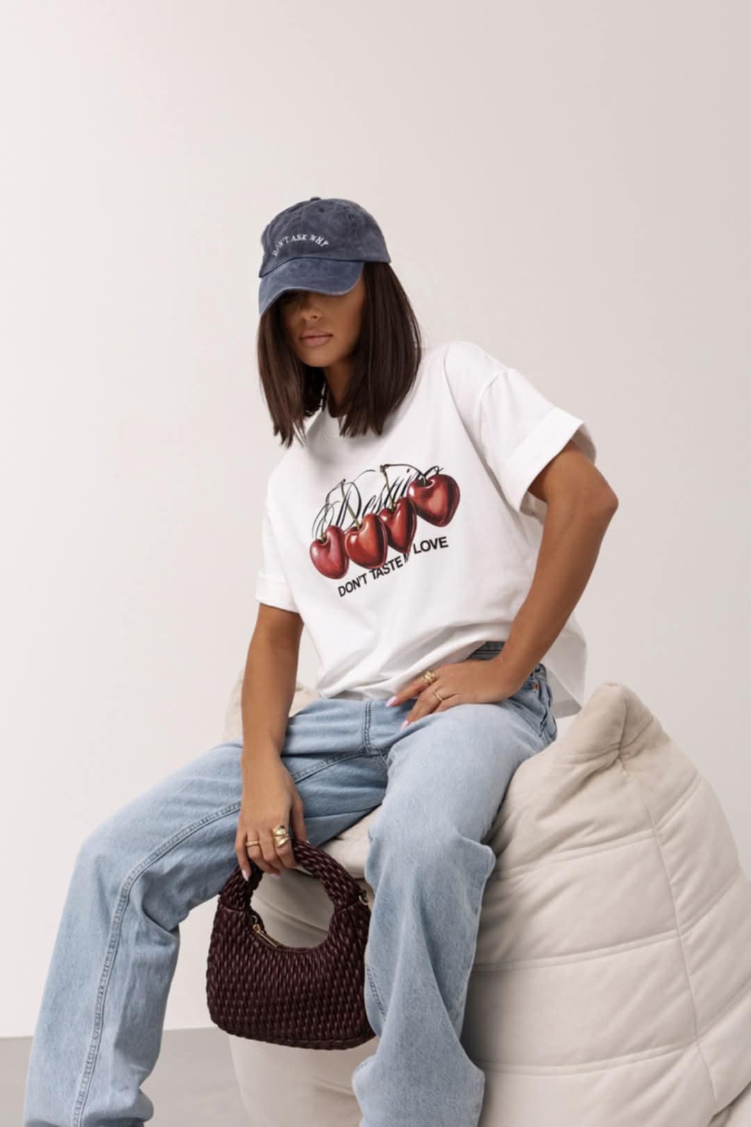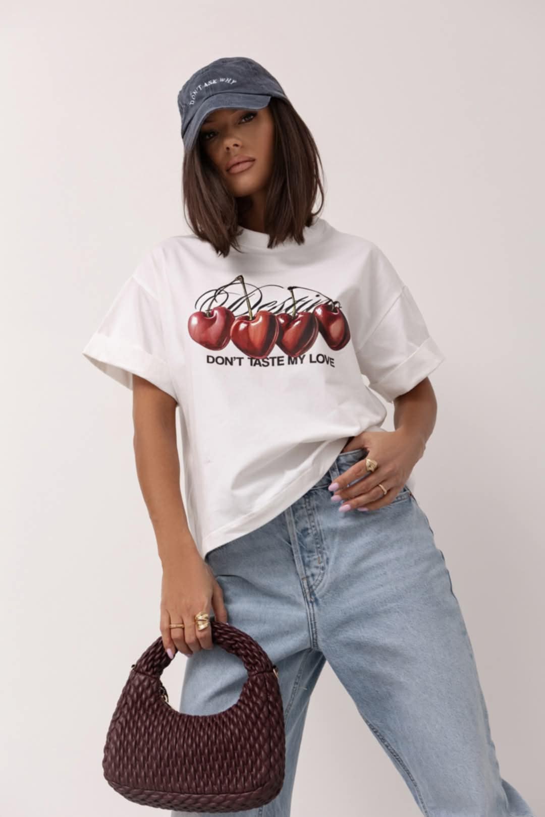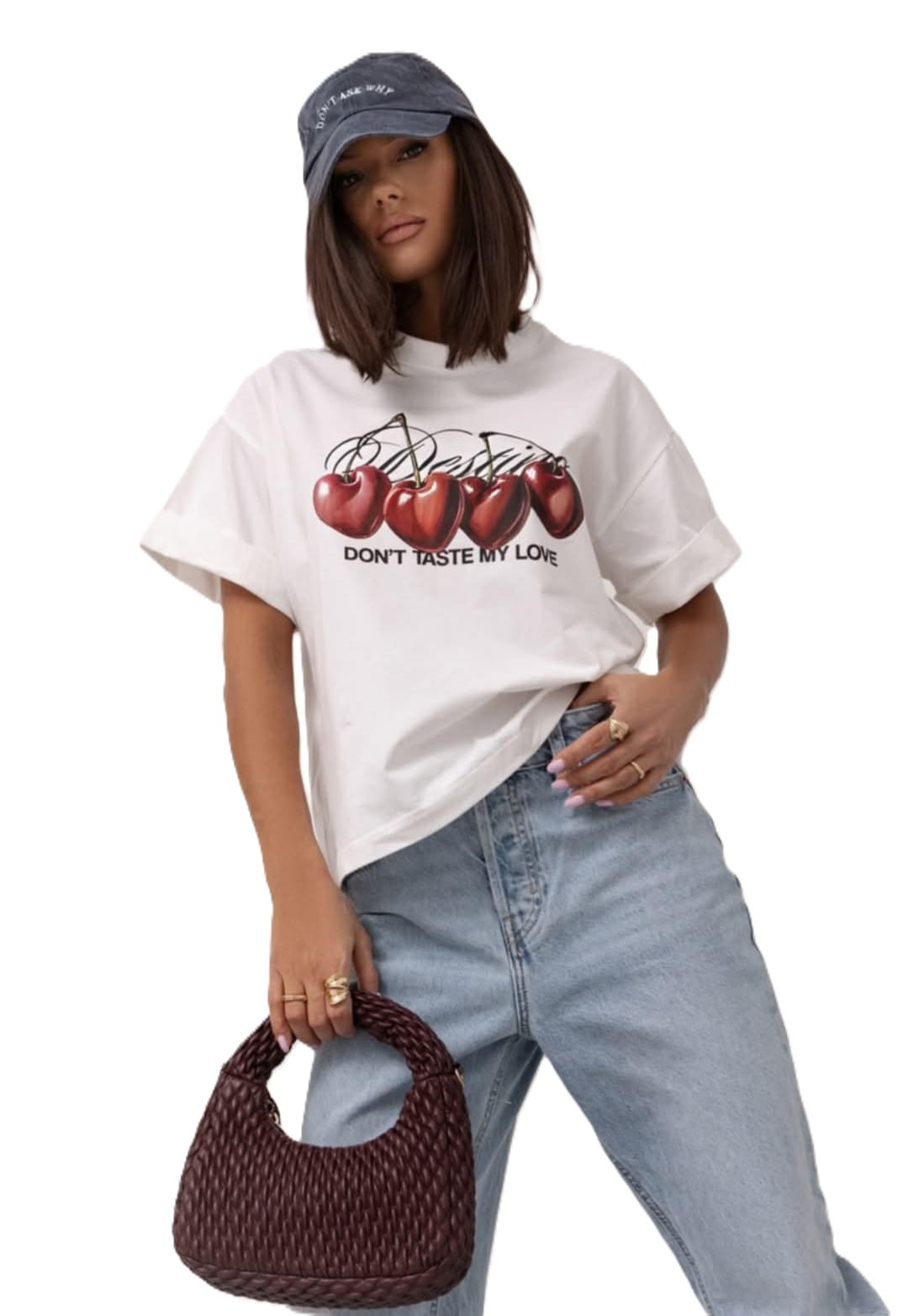 Biały t-shirt oversize z nadrukiem czerwonych wisienek .
