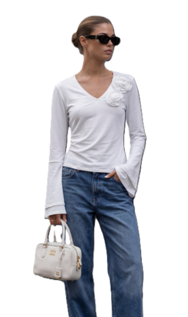 Model o klasycznym kroju z dekoltem w serek, ozdobiony subtelną aplikacją kwiatową na ramieniu, która dodaje całości elegancji i wyjątkowego charakteru.