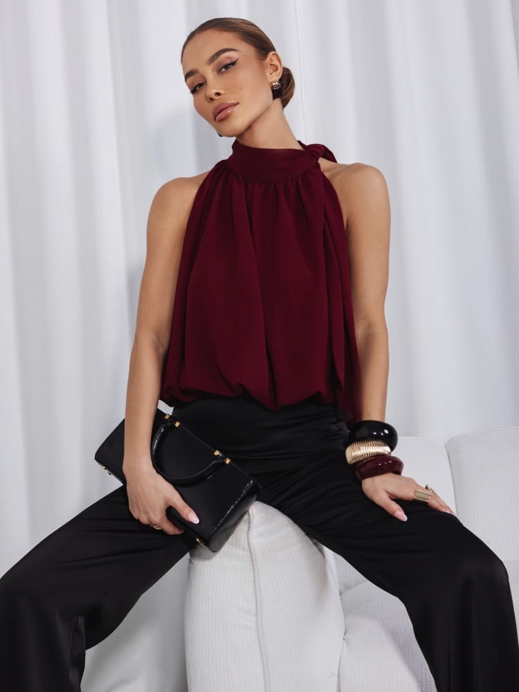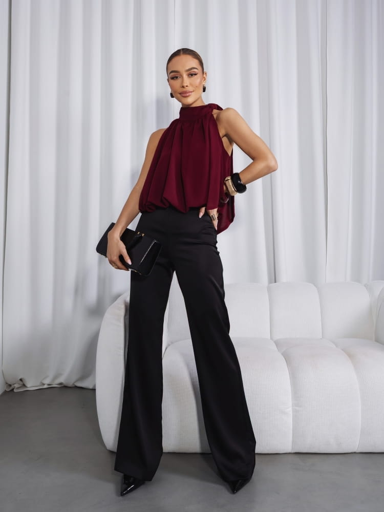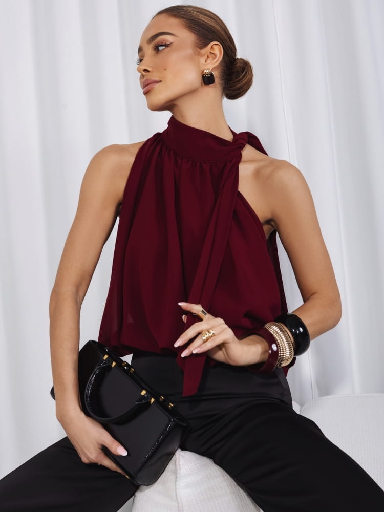 Efektowne wiązanie przy szyi przyciąga wzrok i stanowi wyjątkowy detal, dzięki któremu bluzka sprawdzi się zarówno w stylizacjach wieczorowych, jak i eleganckich zestawach do pracy czy na spotkania.