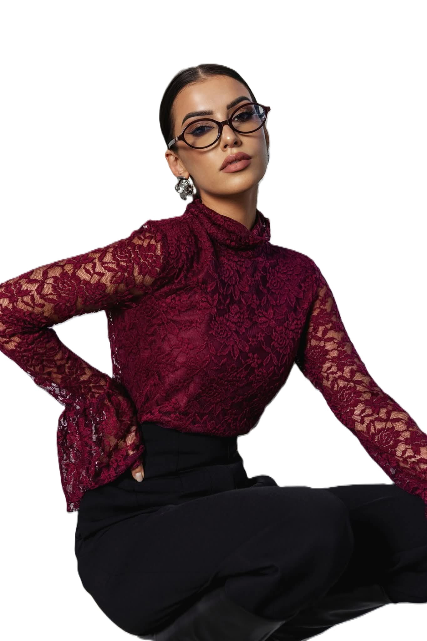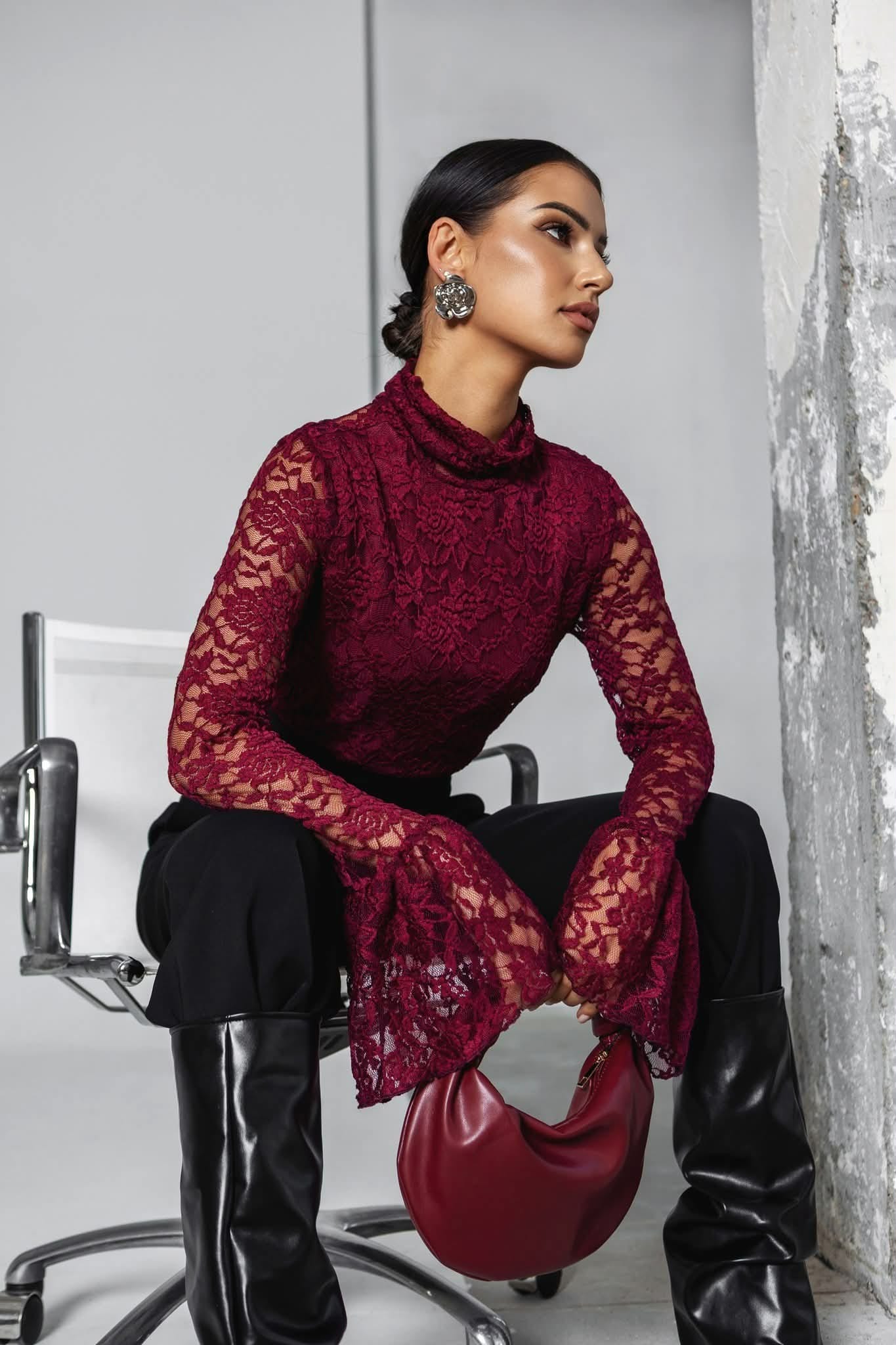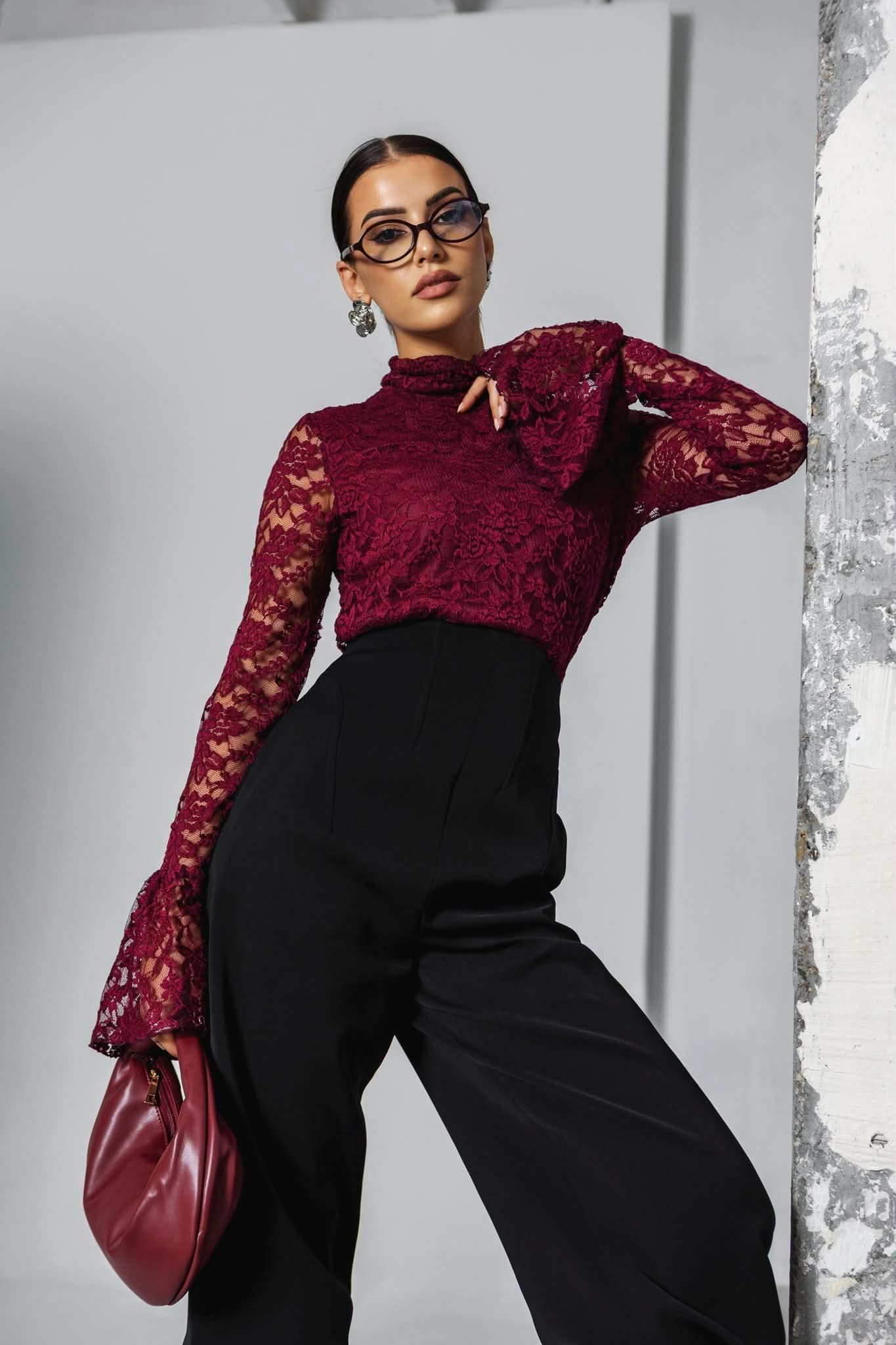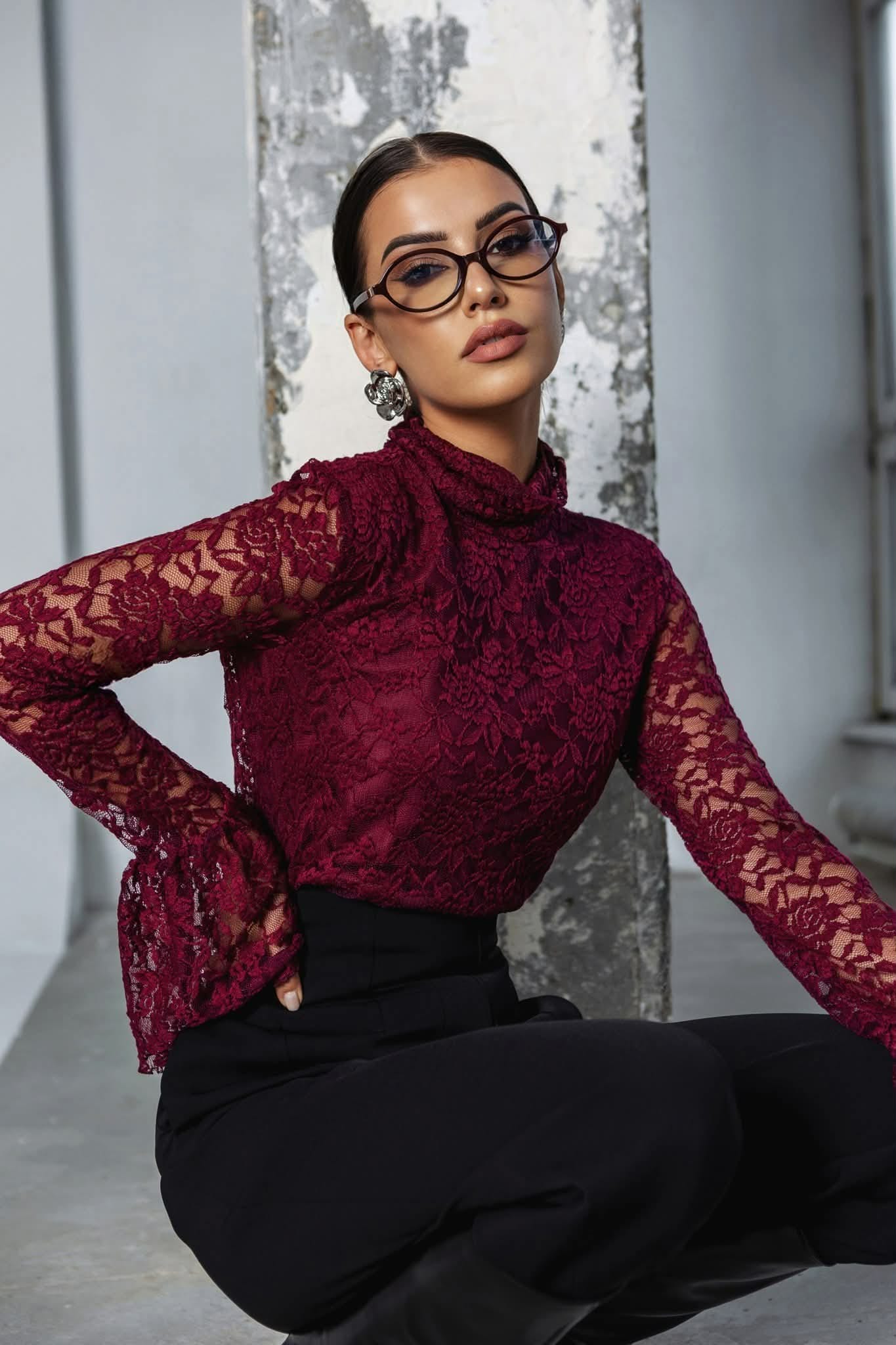 Cocomore bluzka damska koronkowa bordowa długi rękaw dzwonek