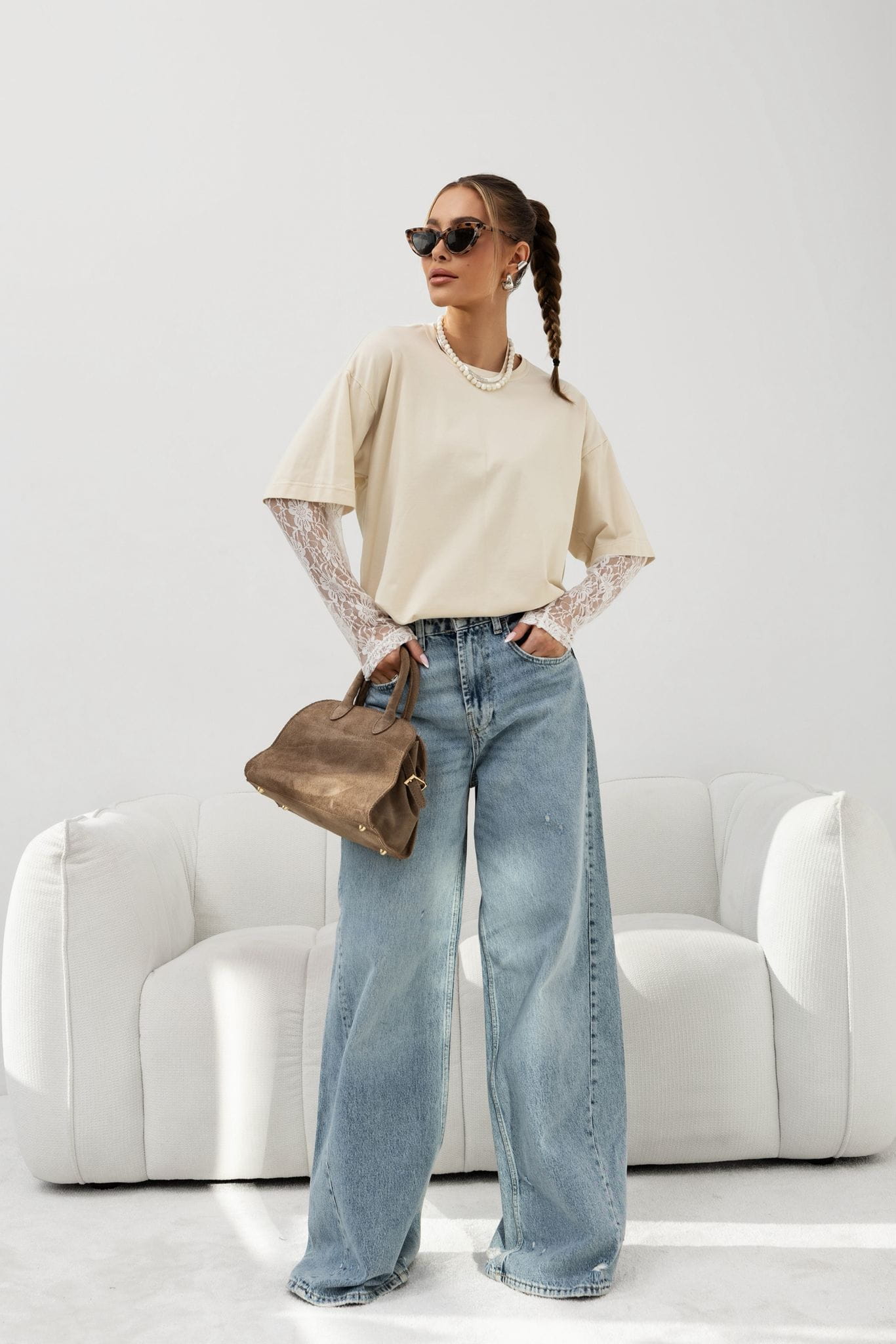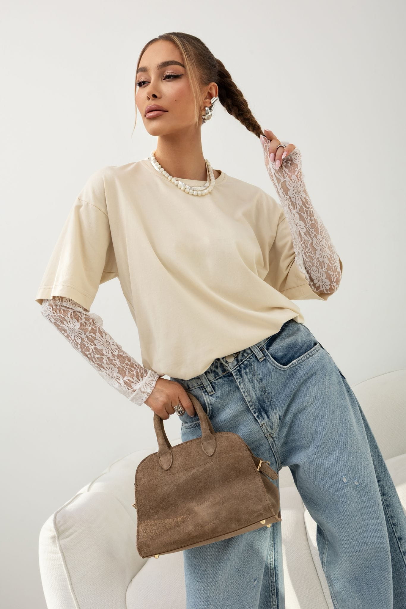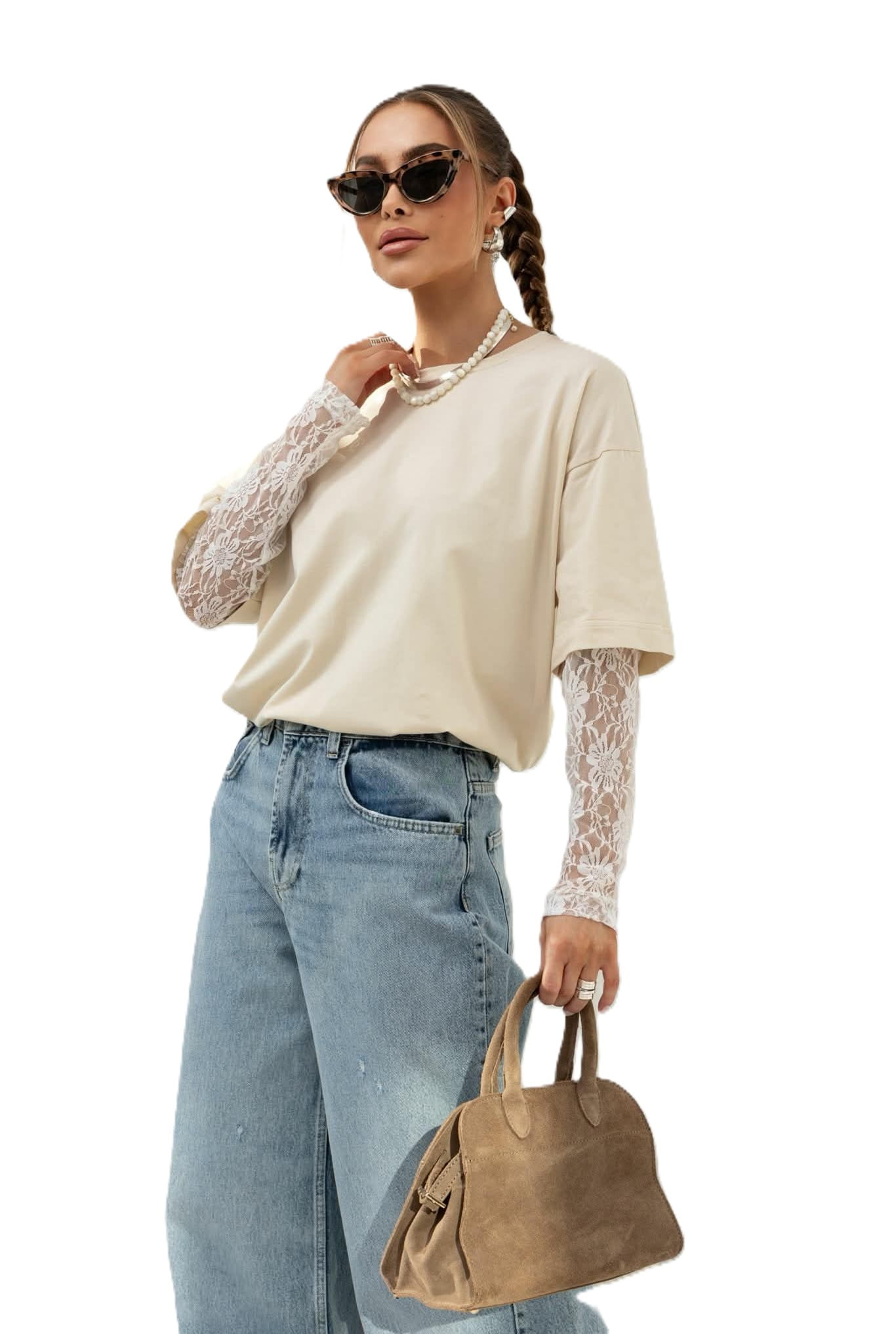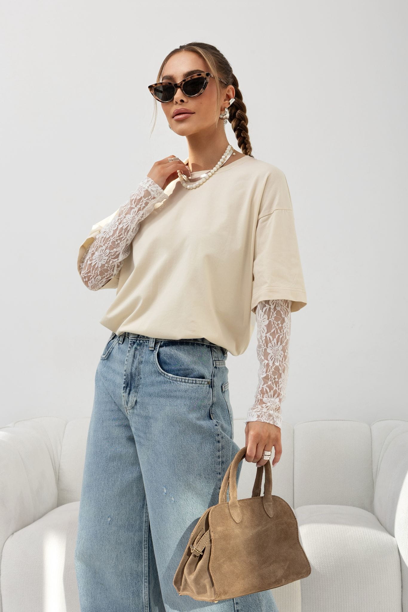 Bluzka damska bawełniana z koronkowymi rękawami – j.beżowa