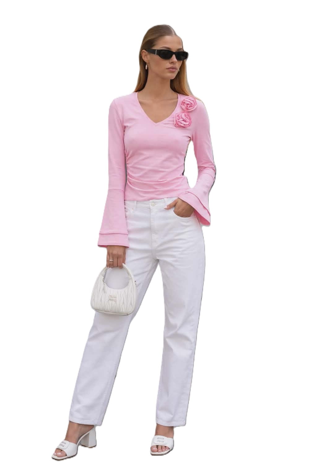 Cocomore bluzka damska z kwiatami 3d rozszerzony rękaw różówa