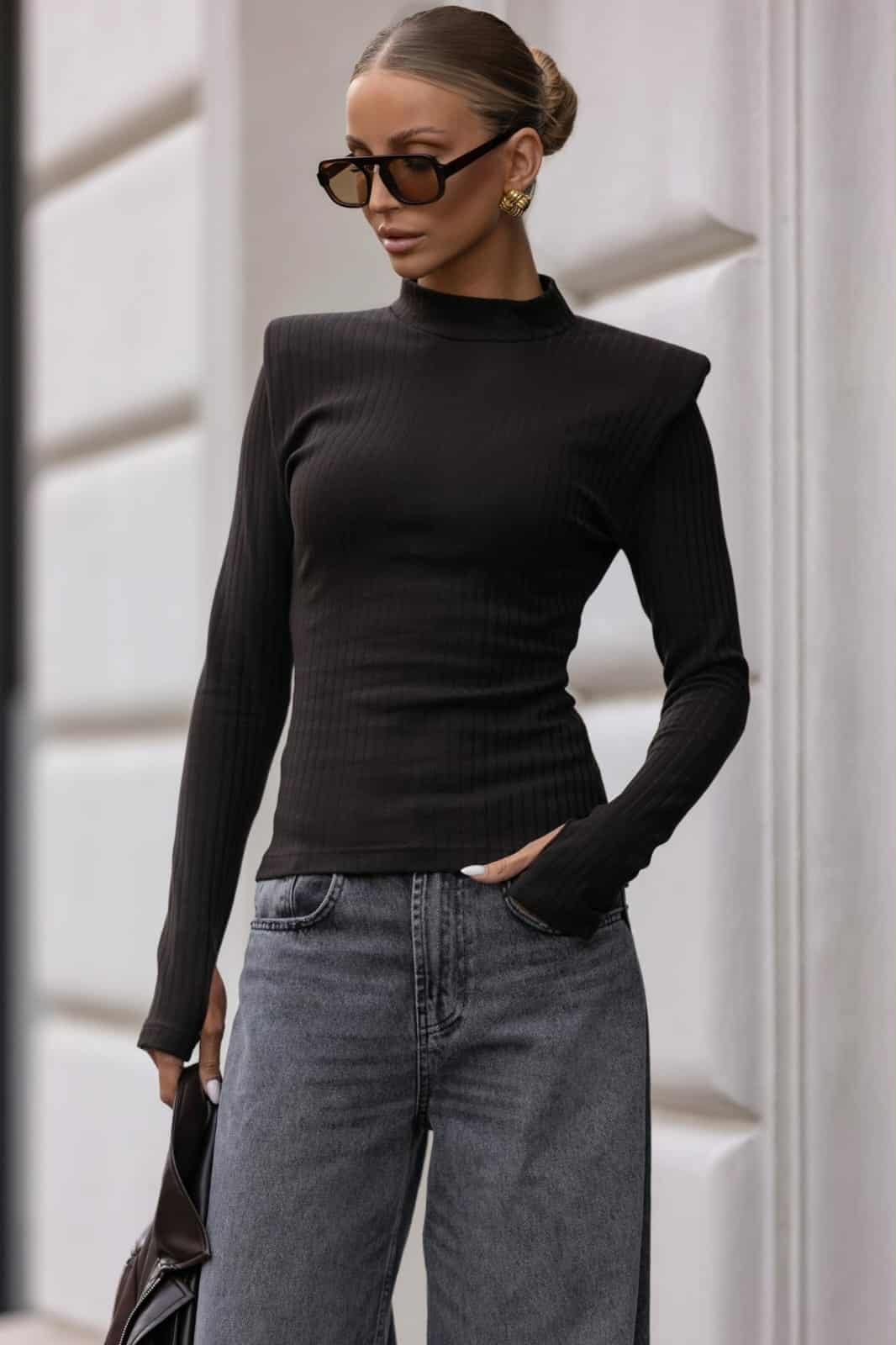 - Design: Modne poduszki na ramionach nadają bluzce wyrazisty charakter i podkreślają linię ramion, dodając stylizacji nowoczesnego twistu.