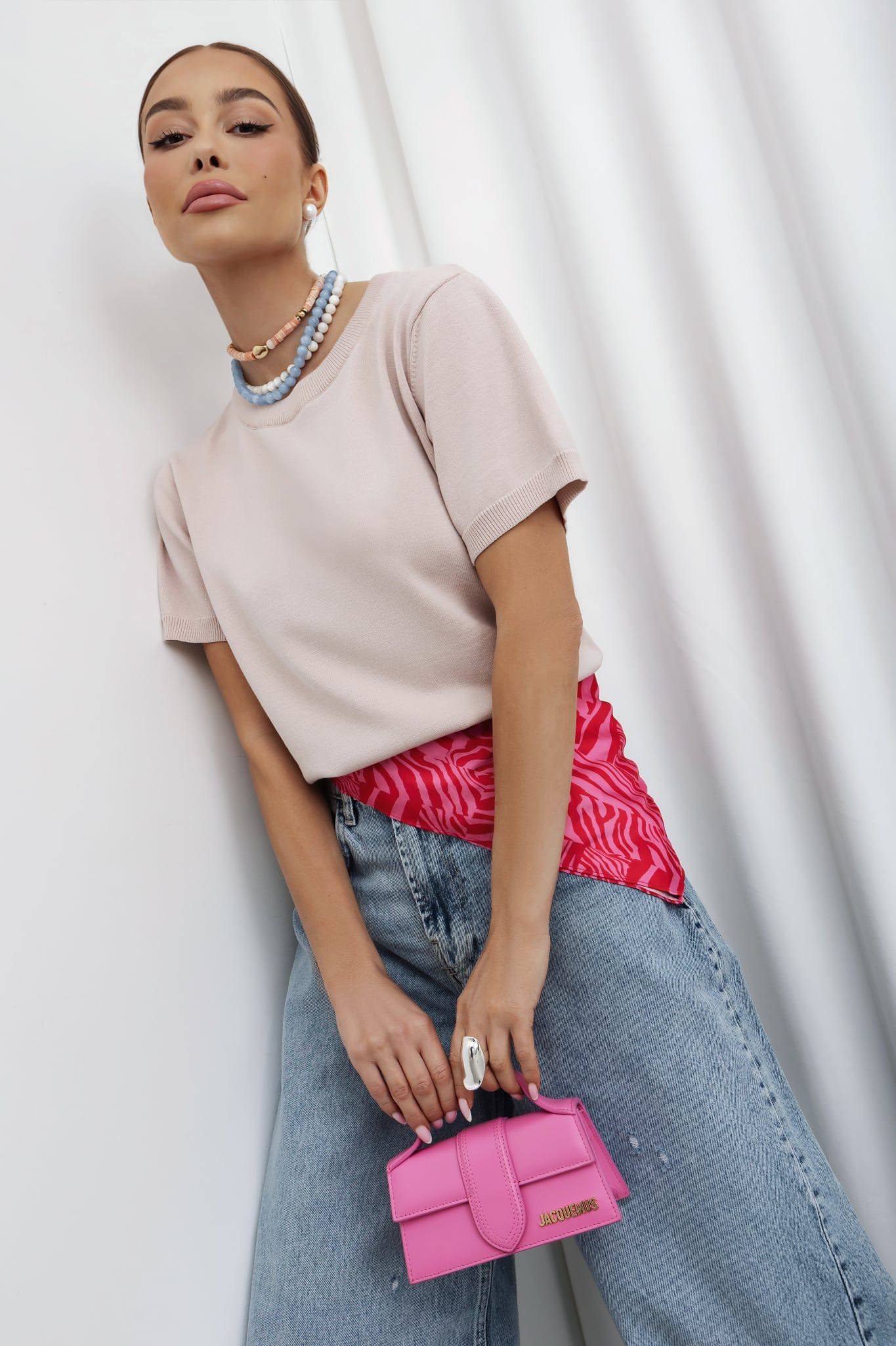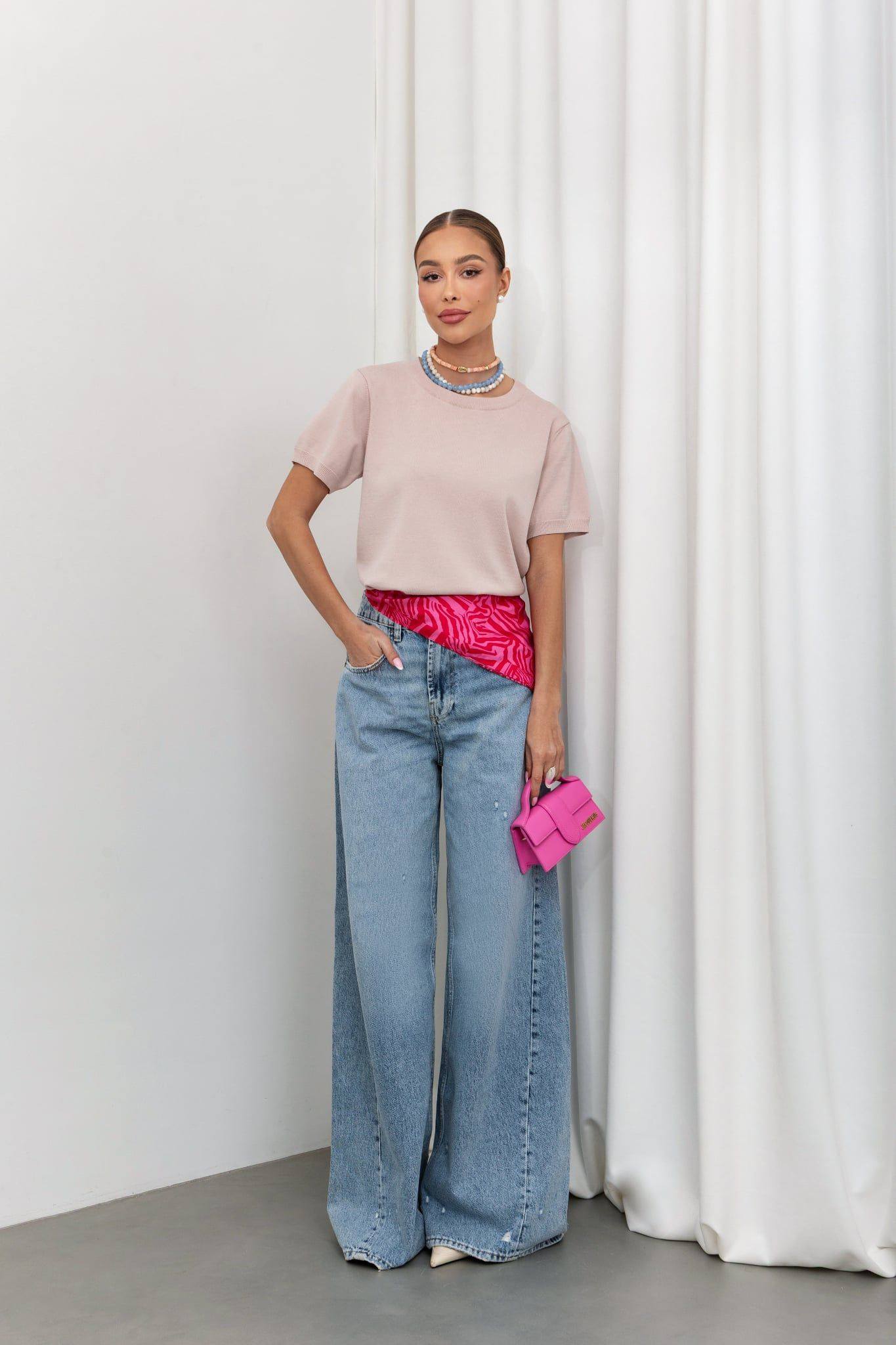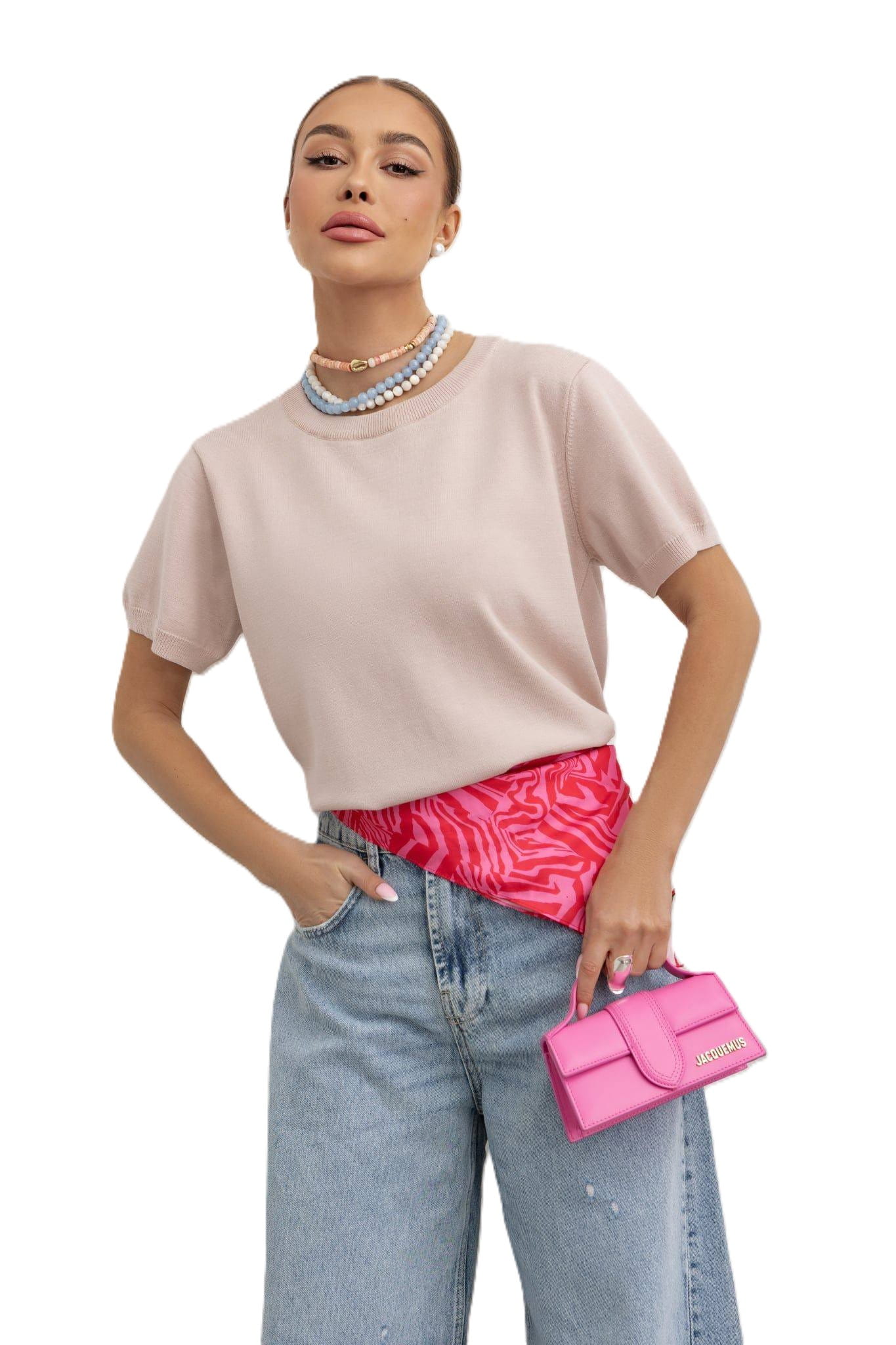 Damska bluzka sweterkowa z krótkim rękawem – jasny róż.