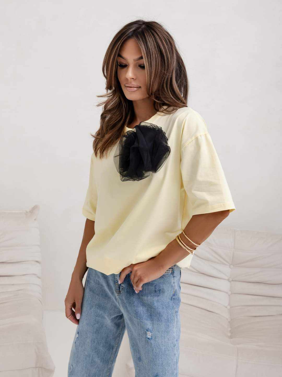 Cocomore damski T-shirt żółty z czarnym kwiatem