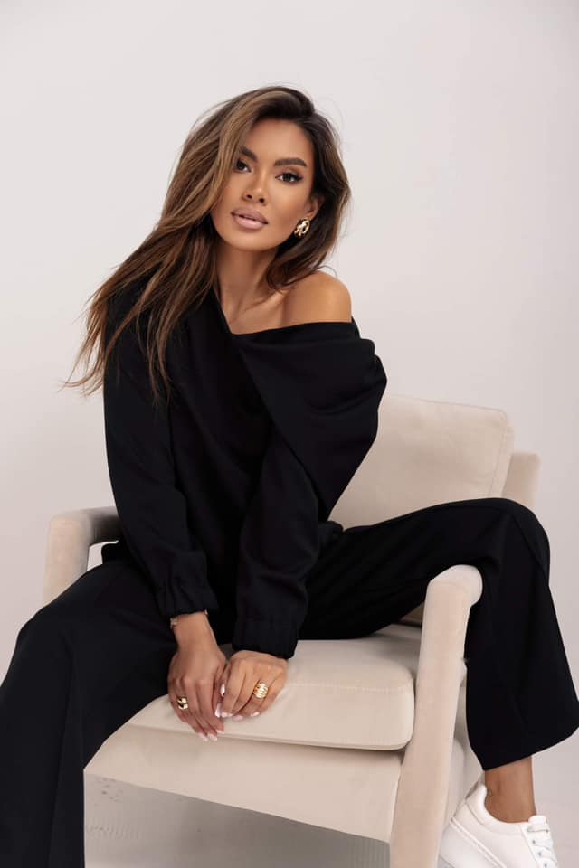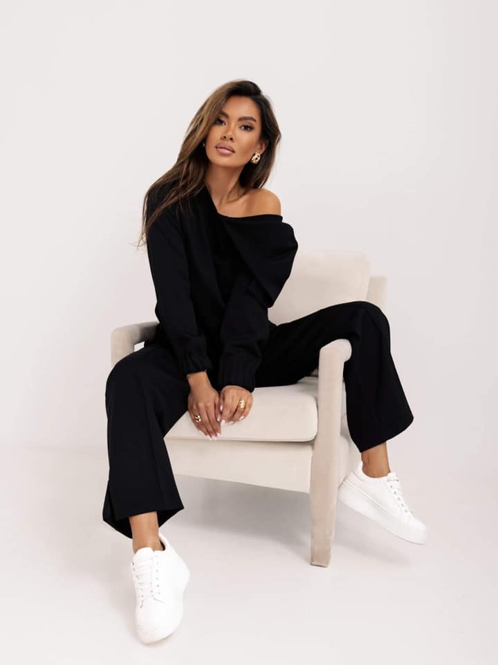 Natomiast spodnie posiadają szerokie nogawki, ozdobione podłużnymi przeszyciami.