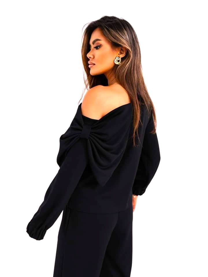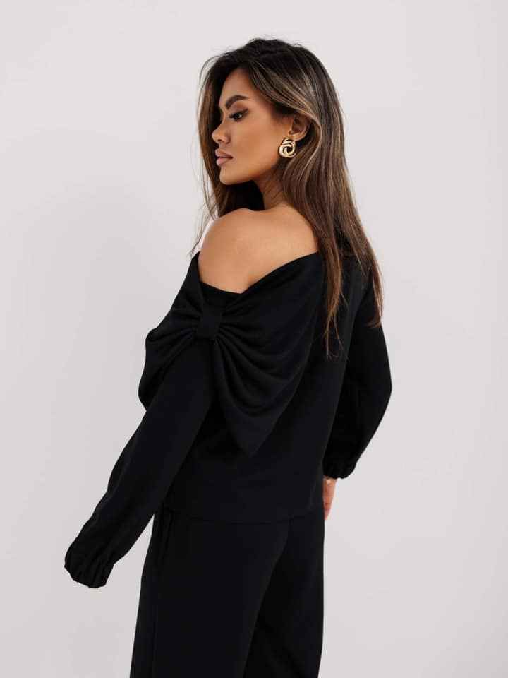 Bluza posiada dekolt opadający na jedna stronę ,ramię wykończone dużą kokardą.
