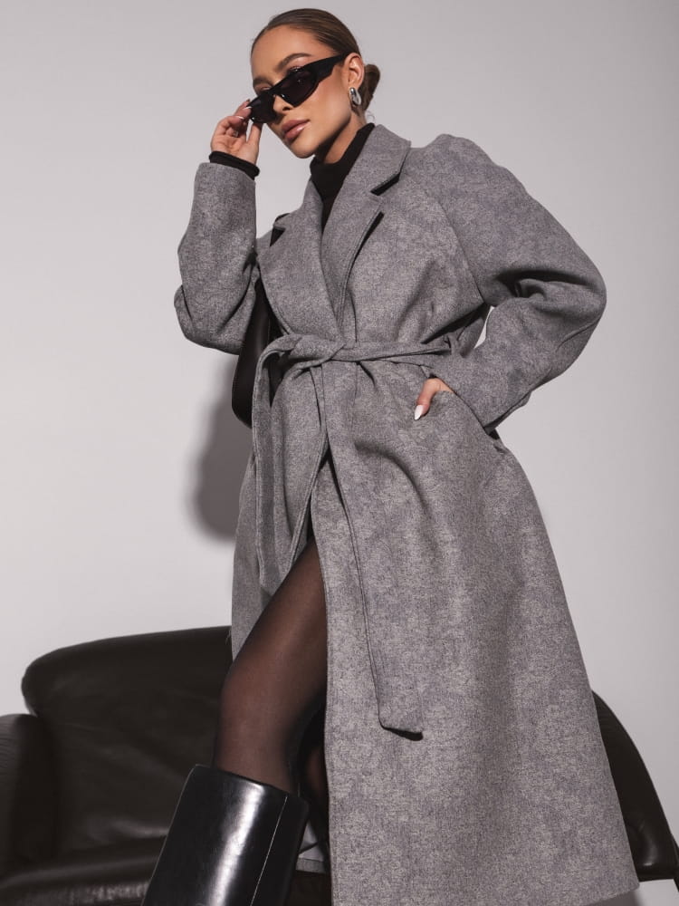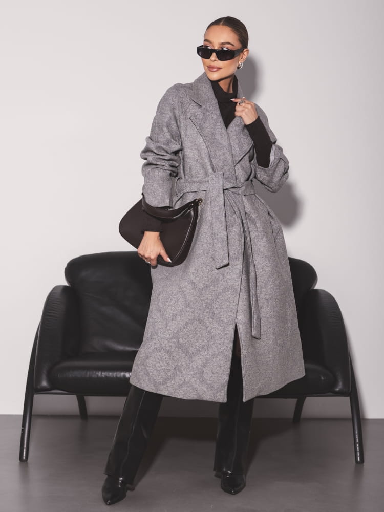 Tkanina posiada subtelny, elegancki wzór, który nadaje całości wyjątkowego charakteru i sprawia, że płaszcz prezentuje się luksusowo.