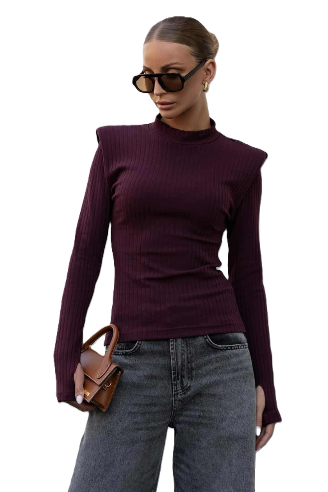 Stylowa bluzka damska półgolf prążkowana z poduszkami na ramionach – bordo.