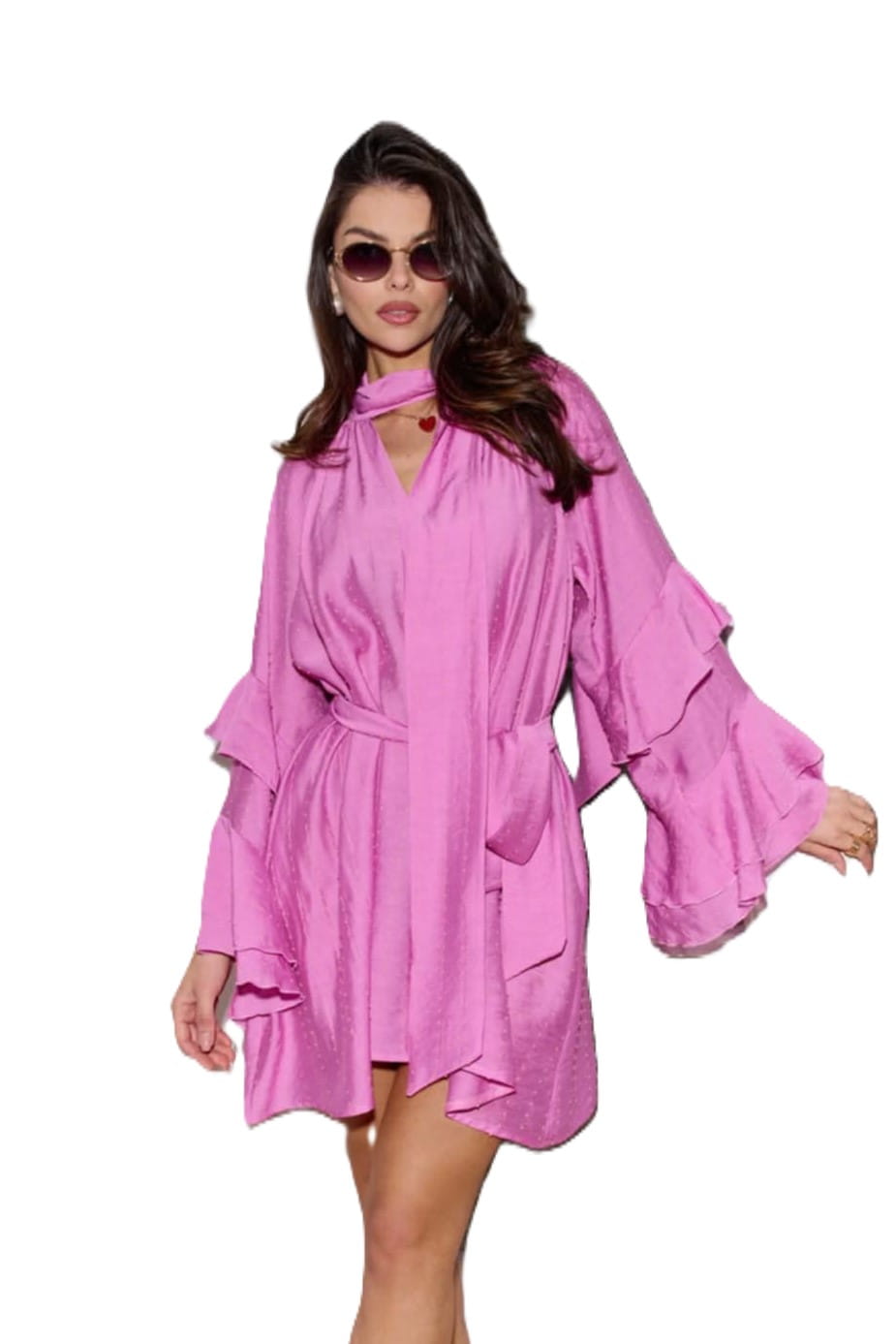Długie, falbaniaste rękawy dodają romantycznego charakteru, a regulacja w talii za pomocą paska pozwala na idealne dopasowanie do sylwetki.