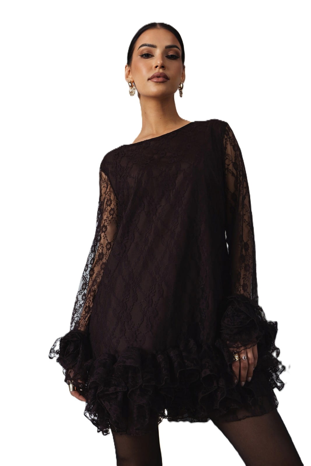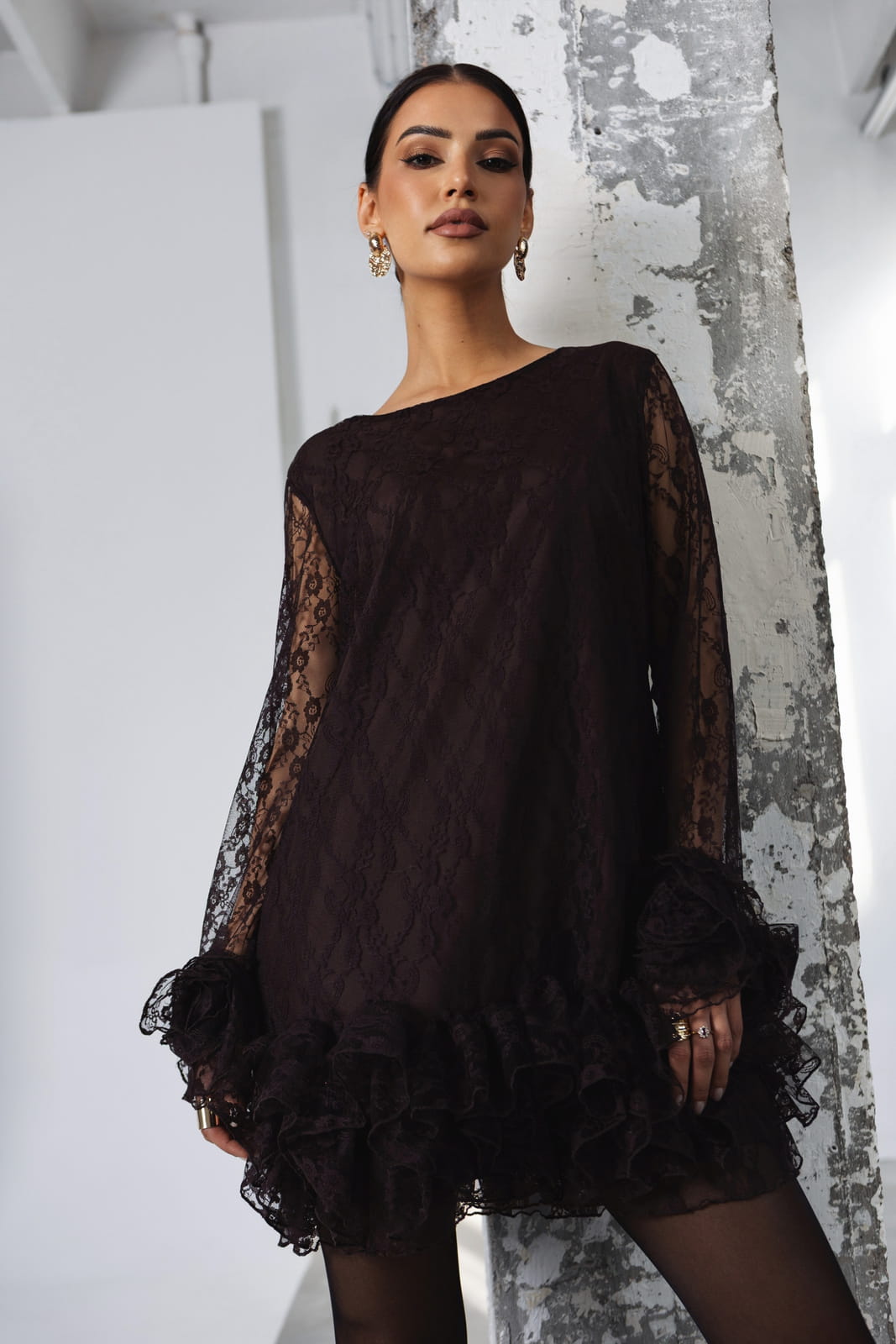 Szerokie, koronkowe rękawy nadają sukience lekkości, a bogato marszczone falbany umieszczone u dołu i przy mankietach dodają objętości i tworzą efektowną, elegancką linię.
