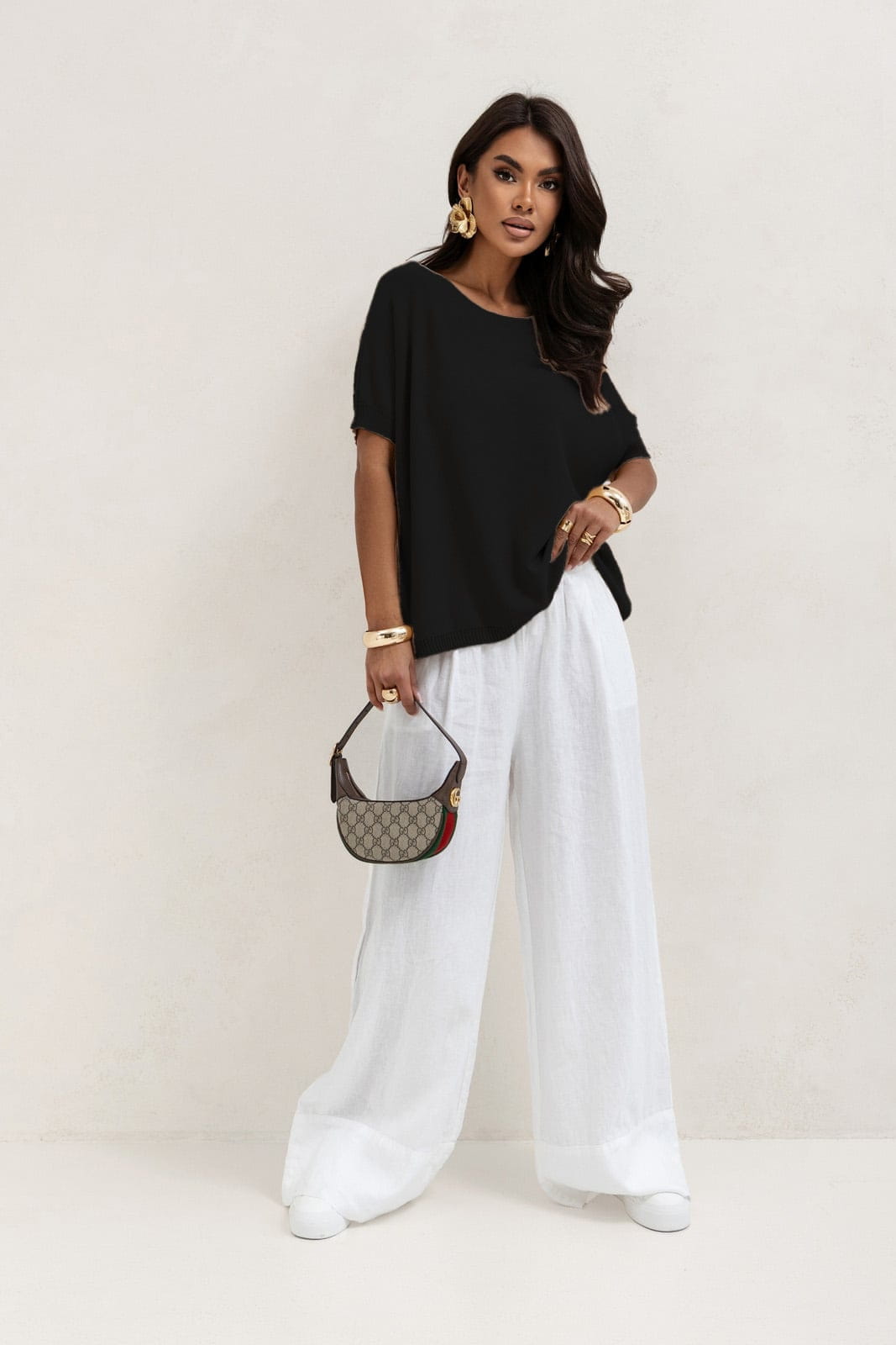 W duecie z białymi, szerokimi spodniami z lnu lub bawełny – lekki, letni zestaw