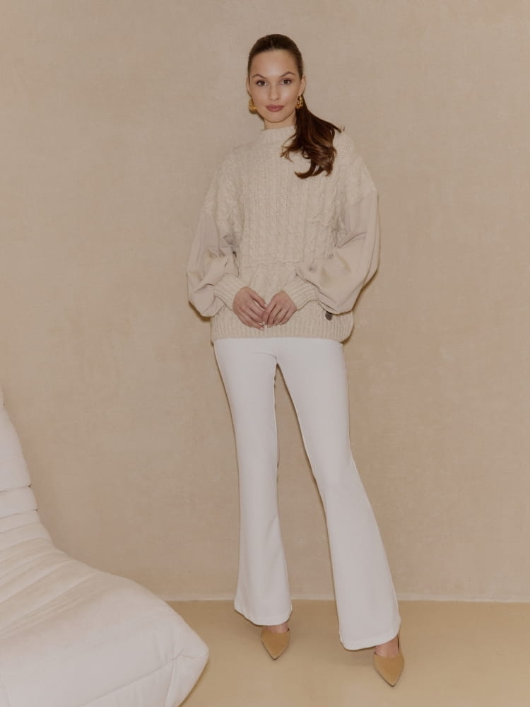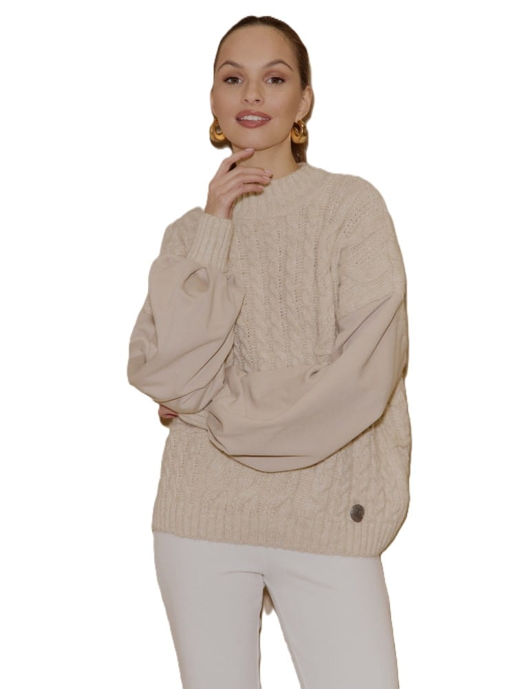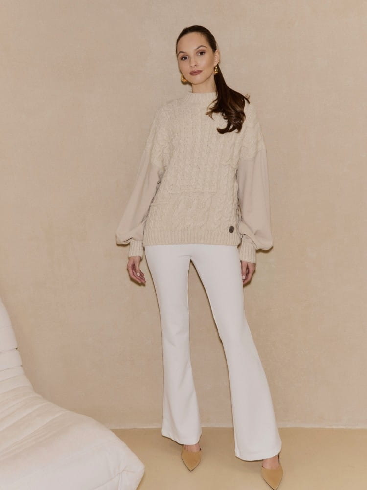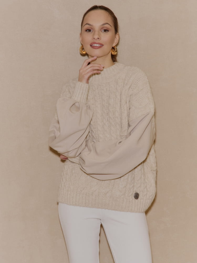Sweter z warkoczowym splotem i dresowymi bufiastymi rękawami.