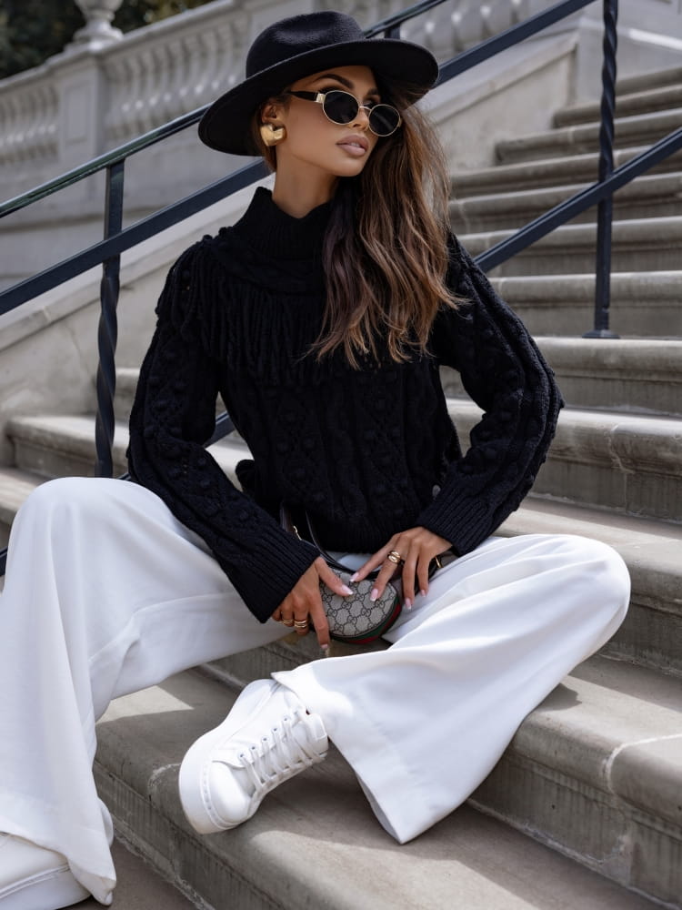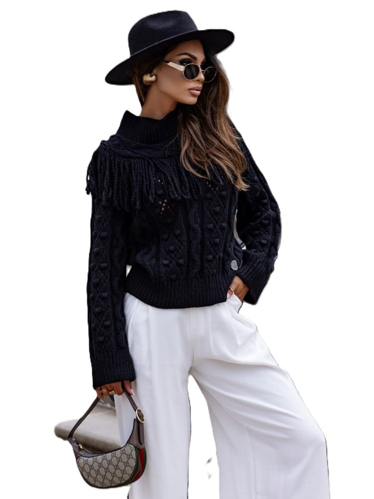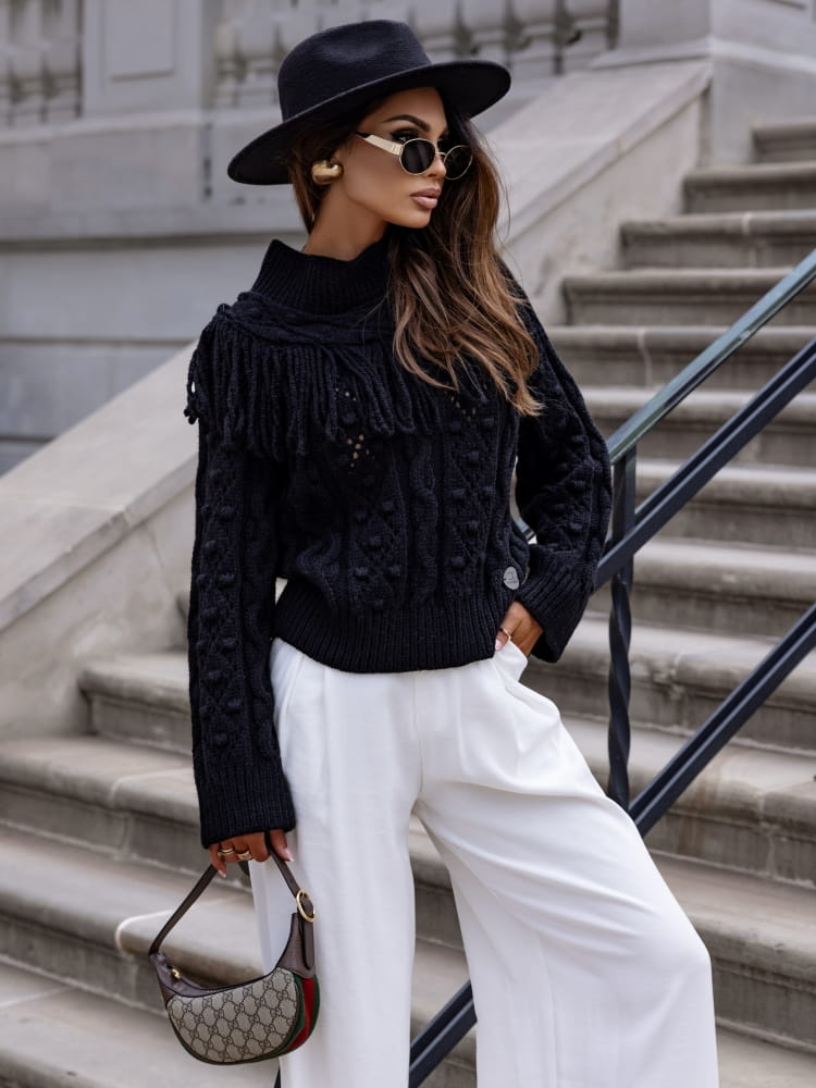 Czarny sweter damski ażurowy z półgolfem, frędzlami i pomponami