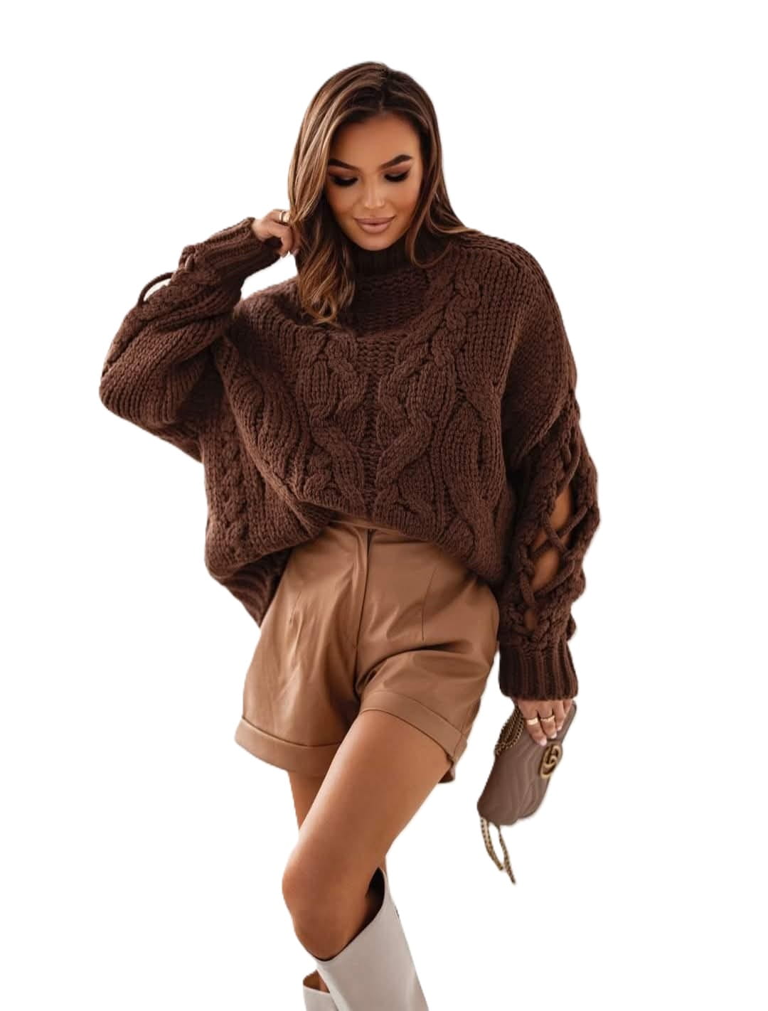 Cocomore sweter damski czekoladowy z ozdobnym rękawem półgolf