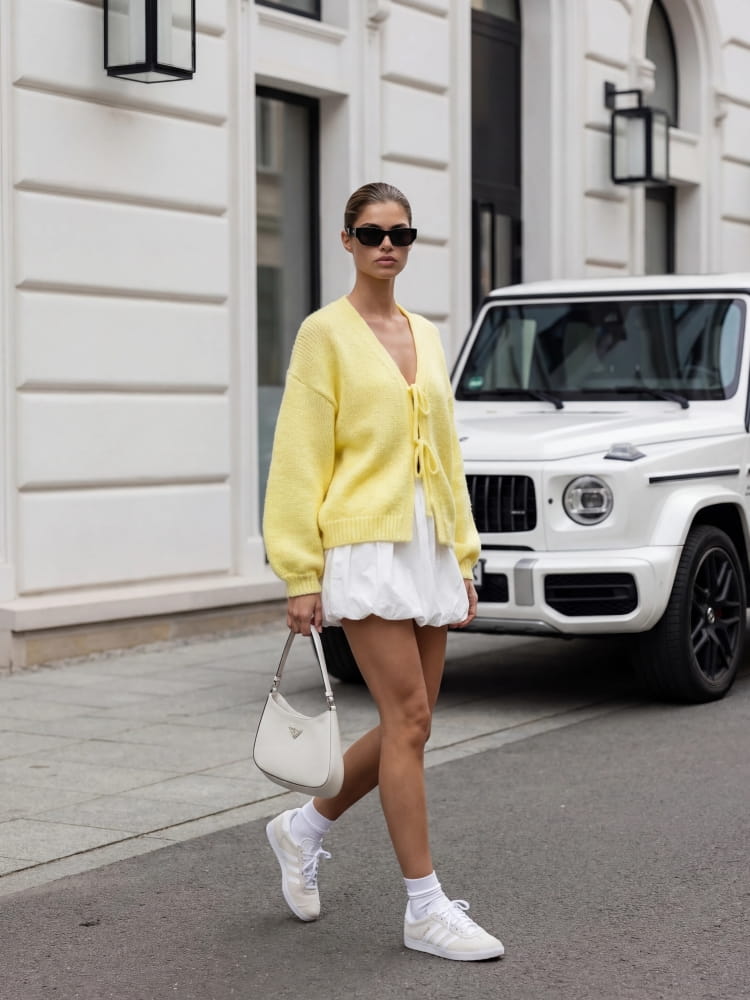 Całość wykończona prążkowanymi ściągaczami, co dodaje lekkości i nowoczesnego charakteru.
