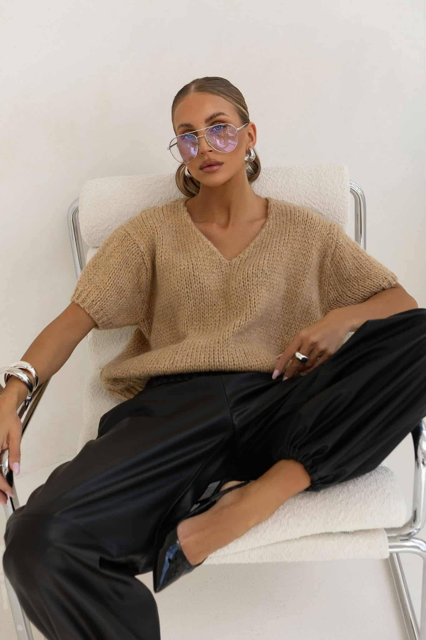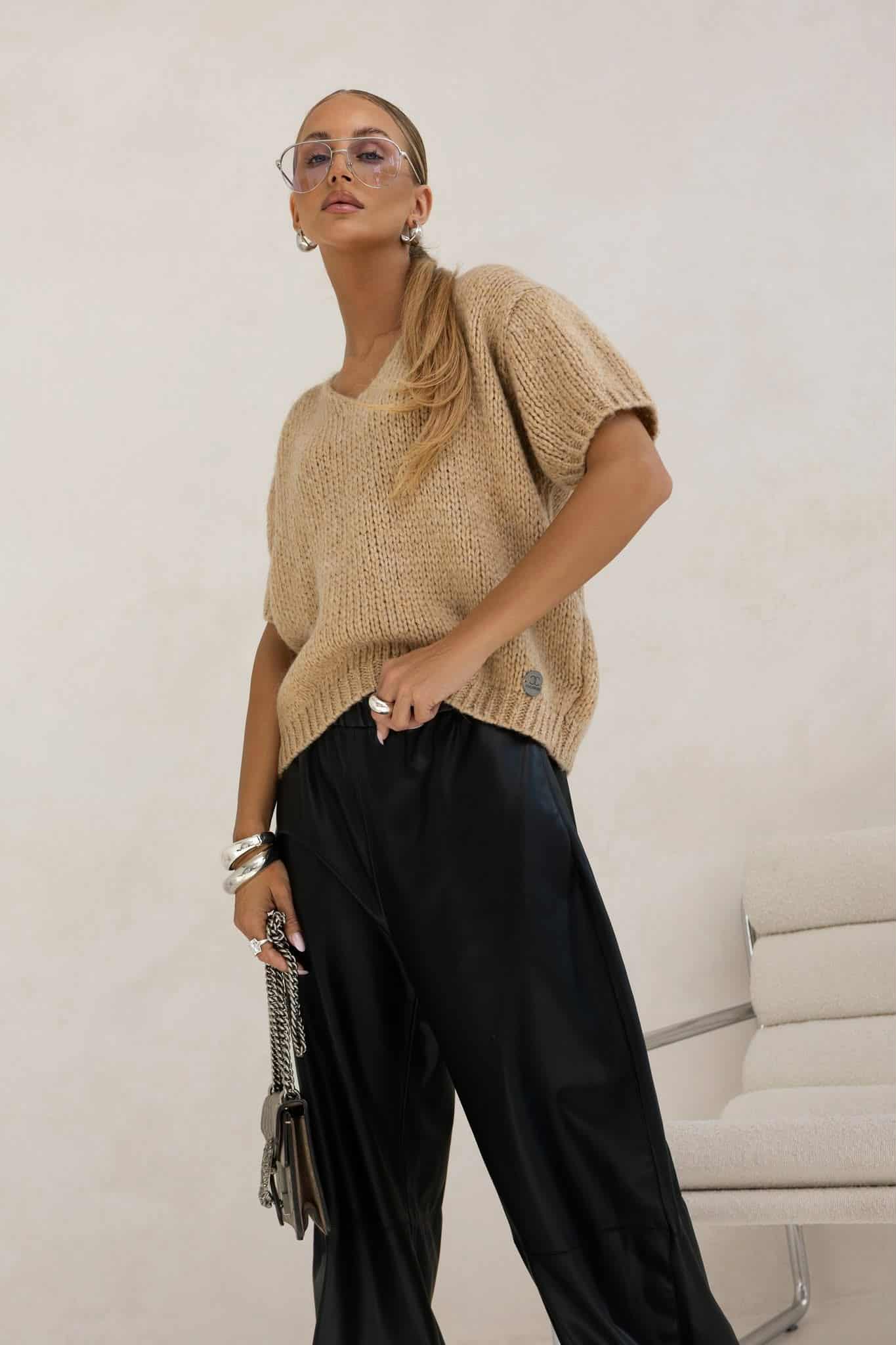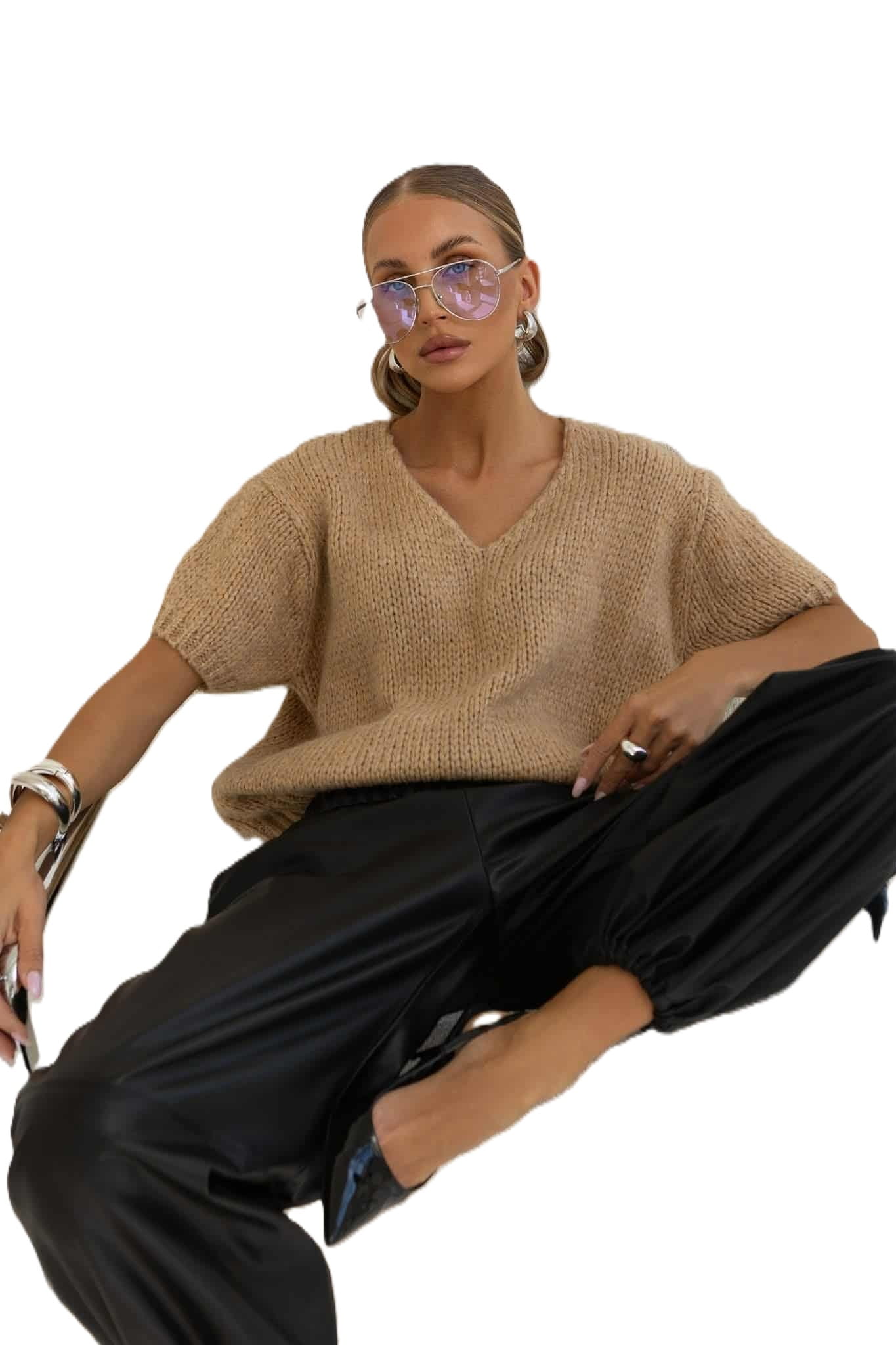 Cocomore sweter damski karmelowy dekolt V rękaw krótki