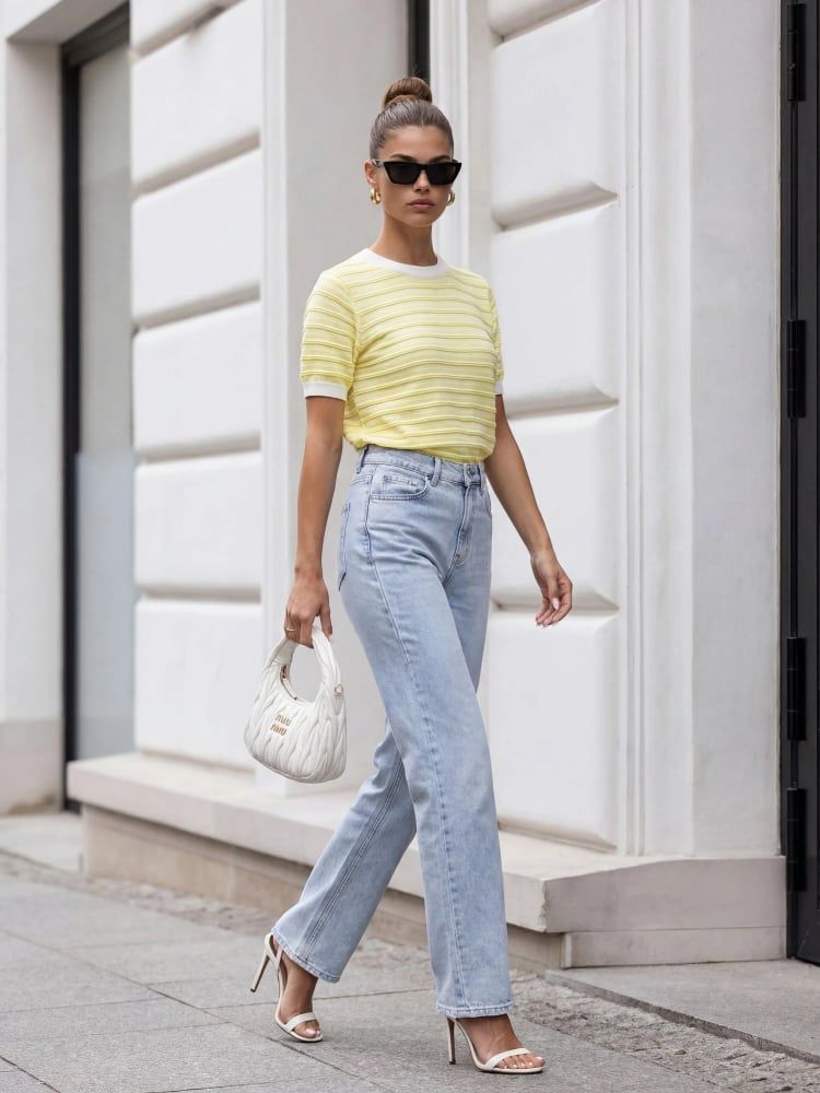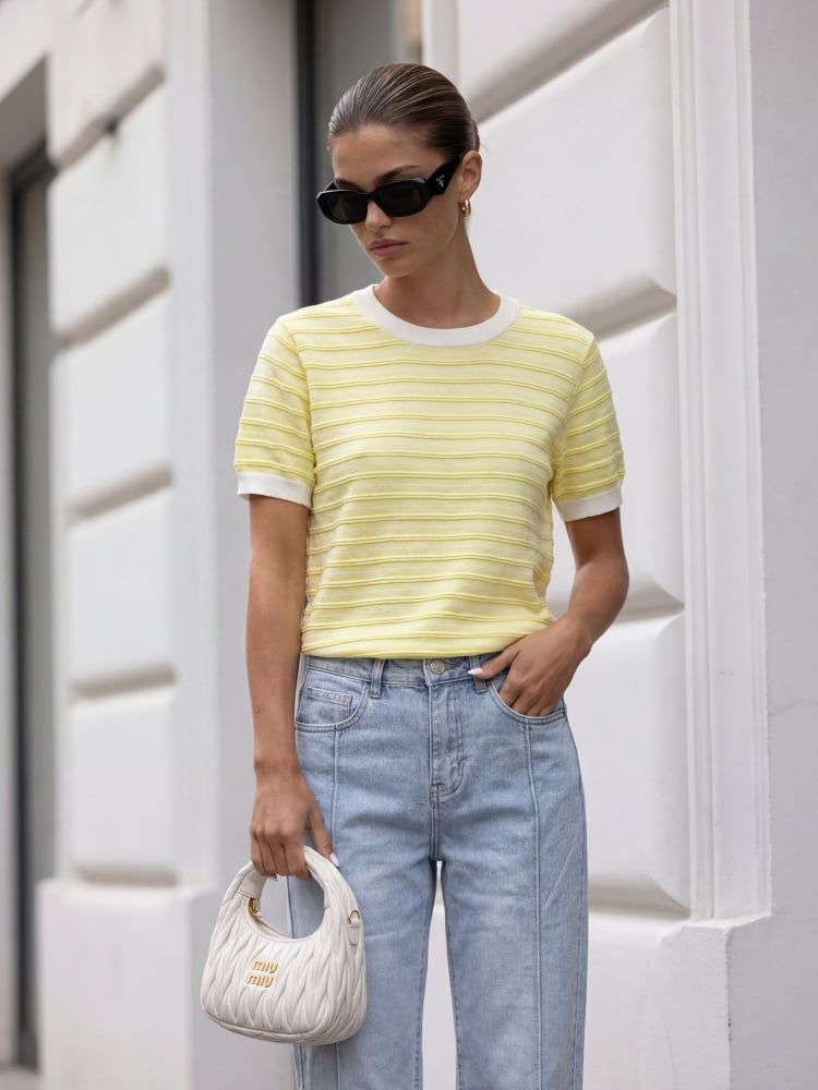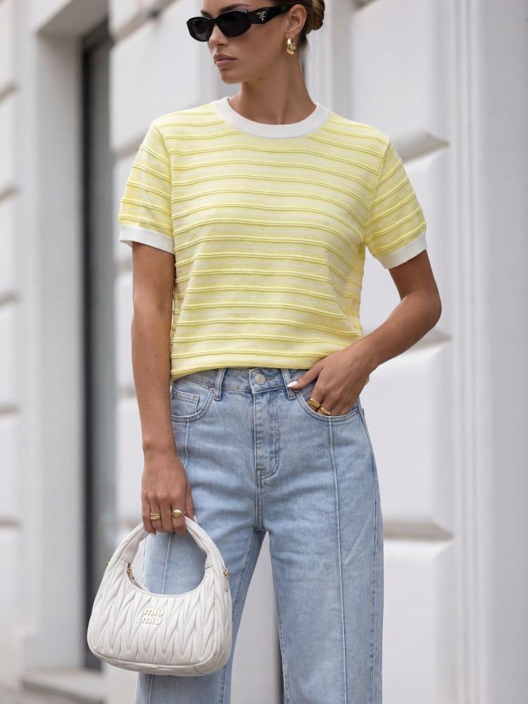 Sweterek o prostym, klasycznym kroju, z krótkim rękawem i okrągłym dekoltem, pięknie układa się na sylwetce i zapewnia komfort noszenia przez cały dzień.