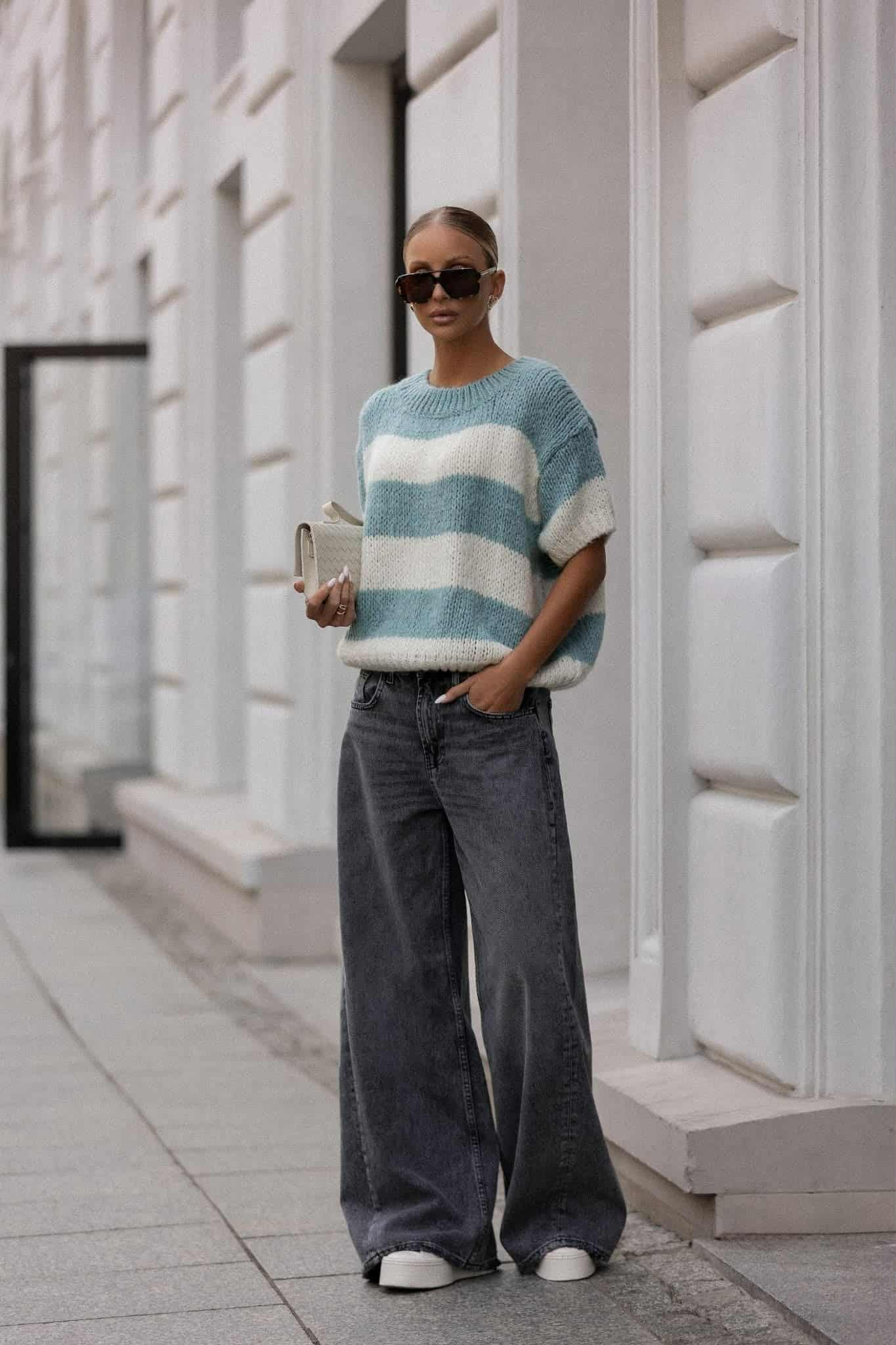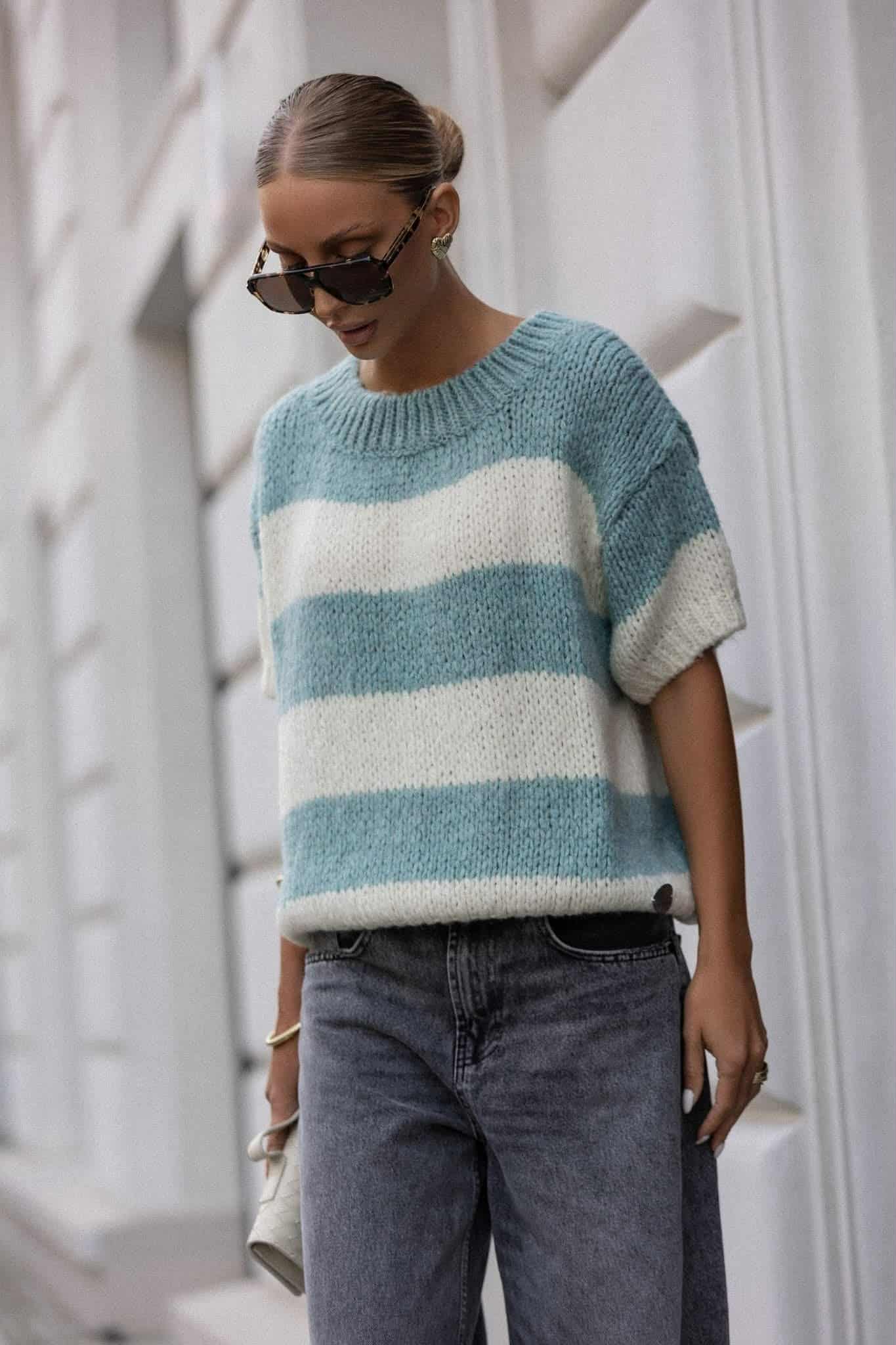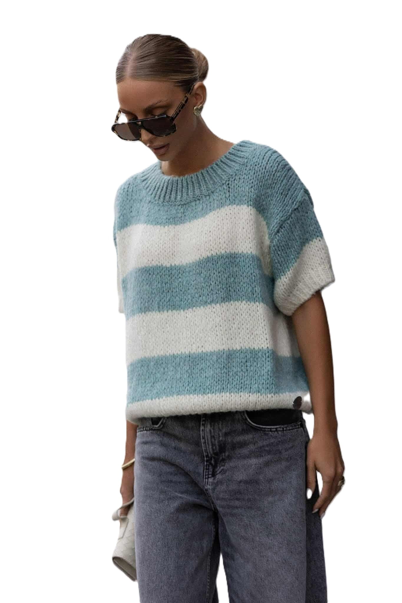 Stylowy sweter damski w biało -miętowe paski, wykonany z wysokiej jakości materiałów przez polskiego producenta.