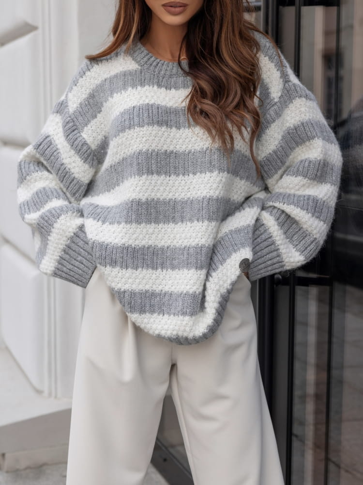 Ciepły, stylowy sweter w biało-szare pasy to idealny wybór na chłodniejsze dni.