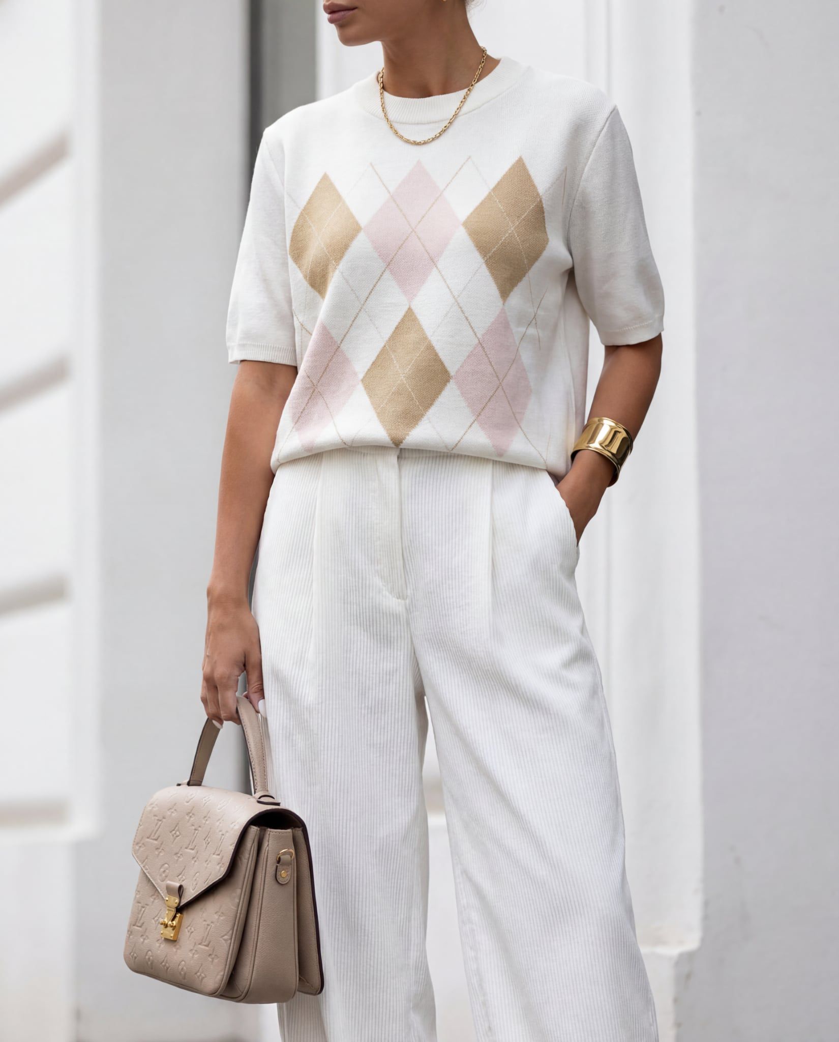 Klasyczny wzór rombów w odcieniach beżu i pudrowego różu nadaje mu ponadczasowego charakteru i sprawia, że model doskonale wpisuje się w eleganckie oraz codzienne stylizacje.