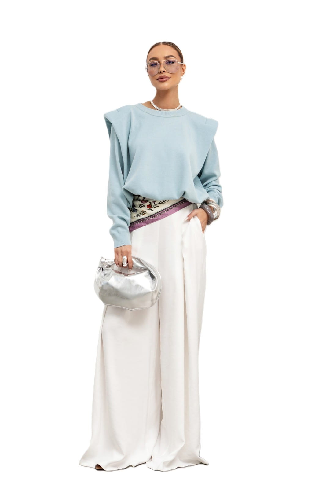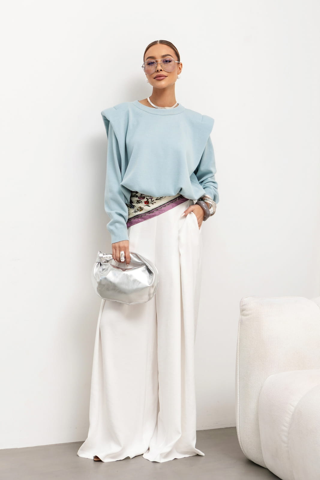 Poduszki na ramionach nadają mu wyrafinowany, lekko strukturalny wygląd, podkreślając sylwetkę.