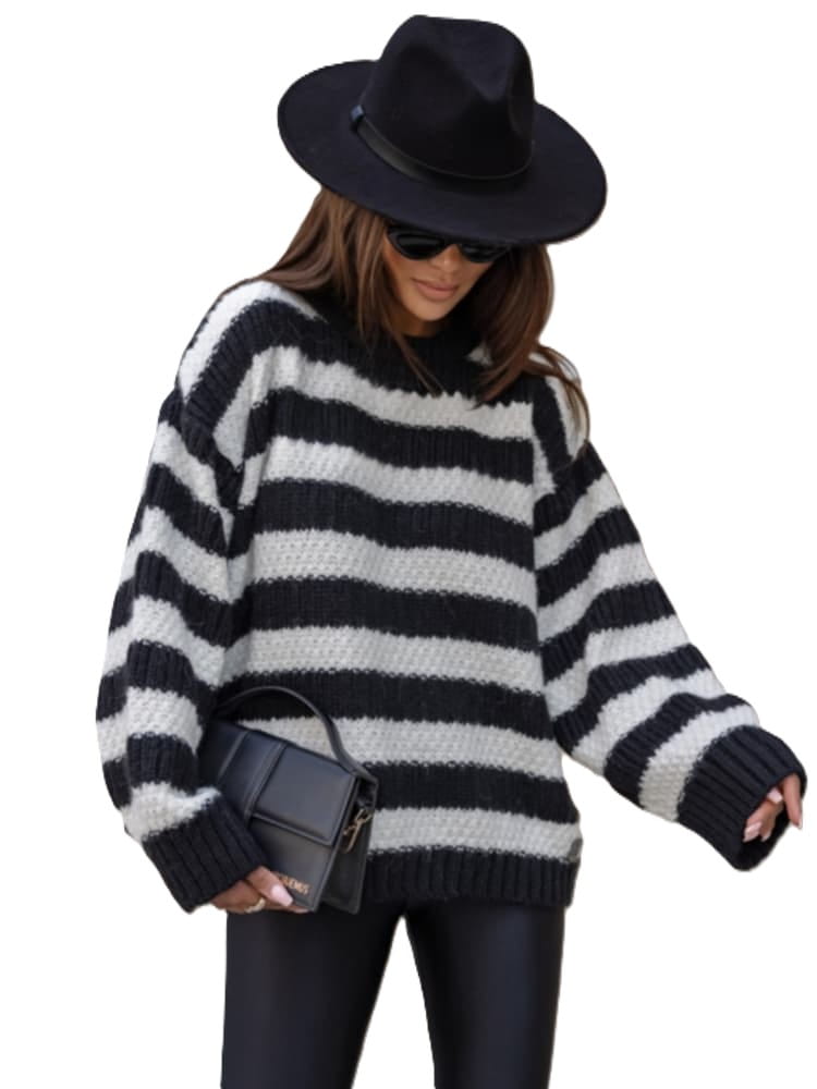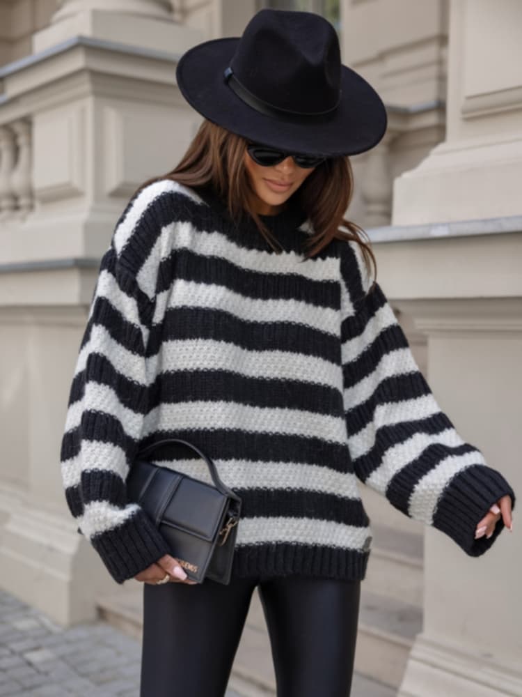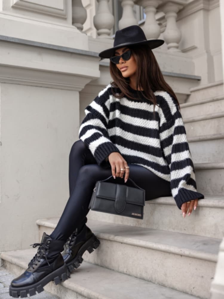 Ciepły, stylowy sweter w biało-czarne pasy to idealny wybór na chłodniejsze dni.