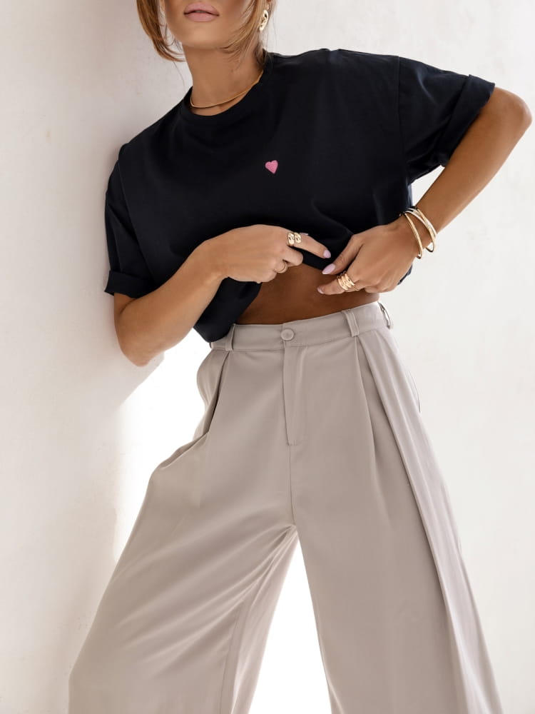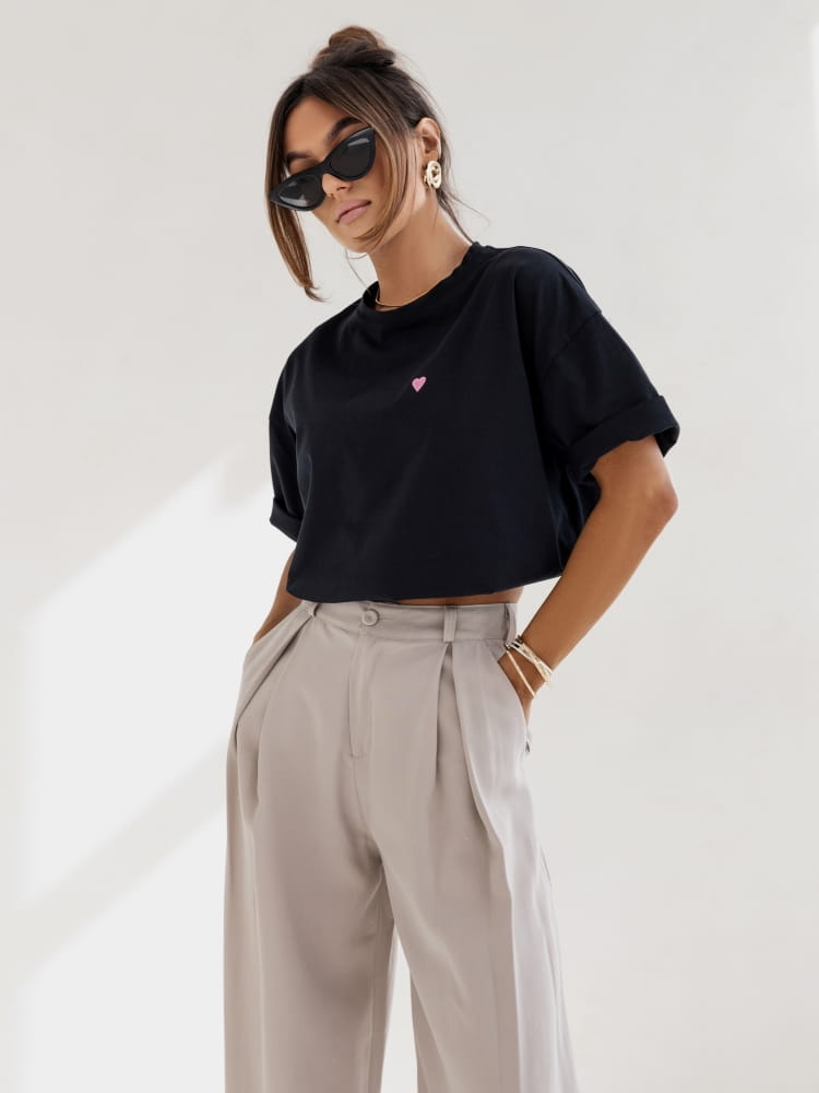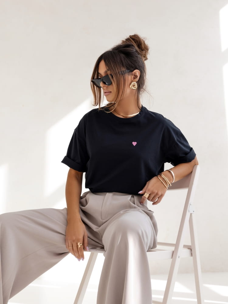 Czarny t-shirt z serduszkiem to klasyczny element garderoby, który łączy w sobie prostotę i subtelną elegancję.