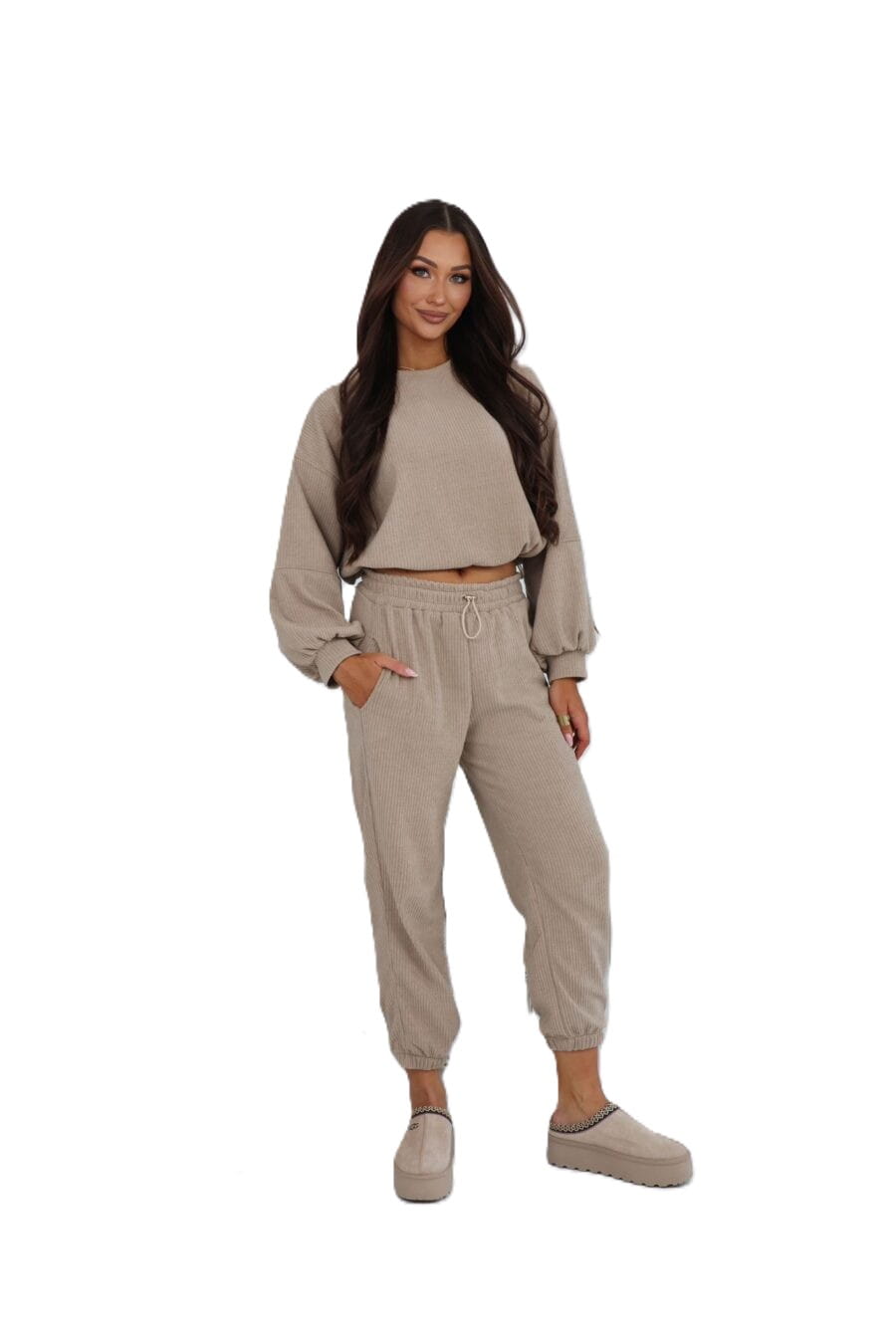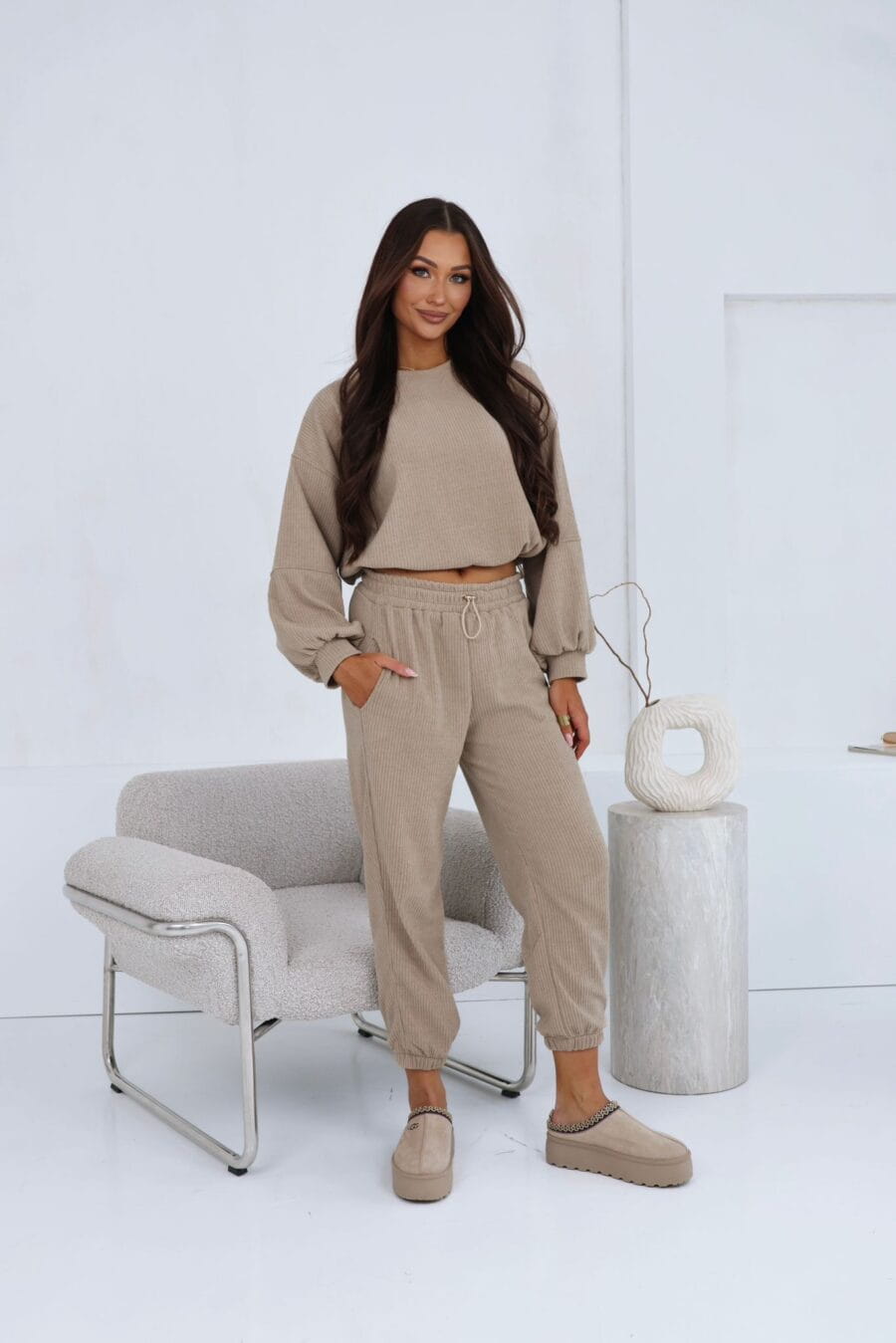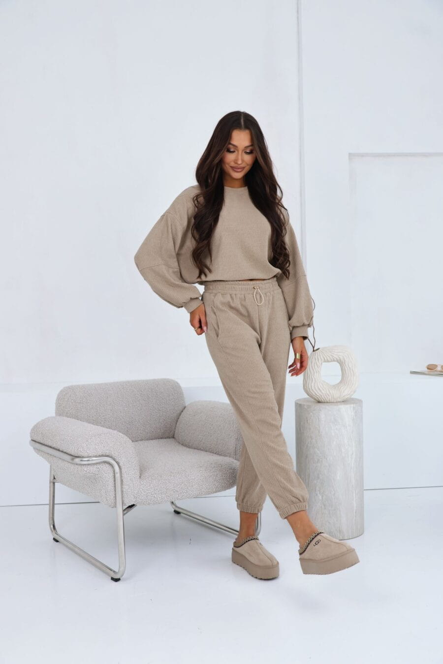 Modny beżowy komplet damski z materiału o strukturze przypominającej sztruks to idealna propozycja dla kobiet, które cenią wygodę i styl w codziennych stylizacjach.