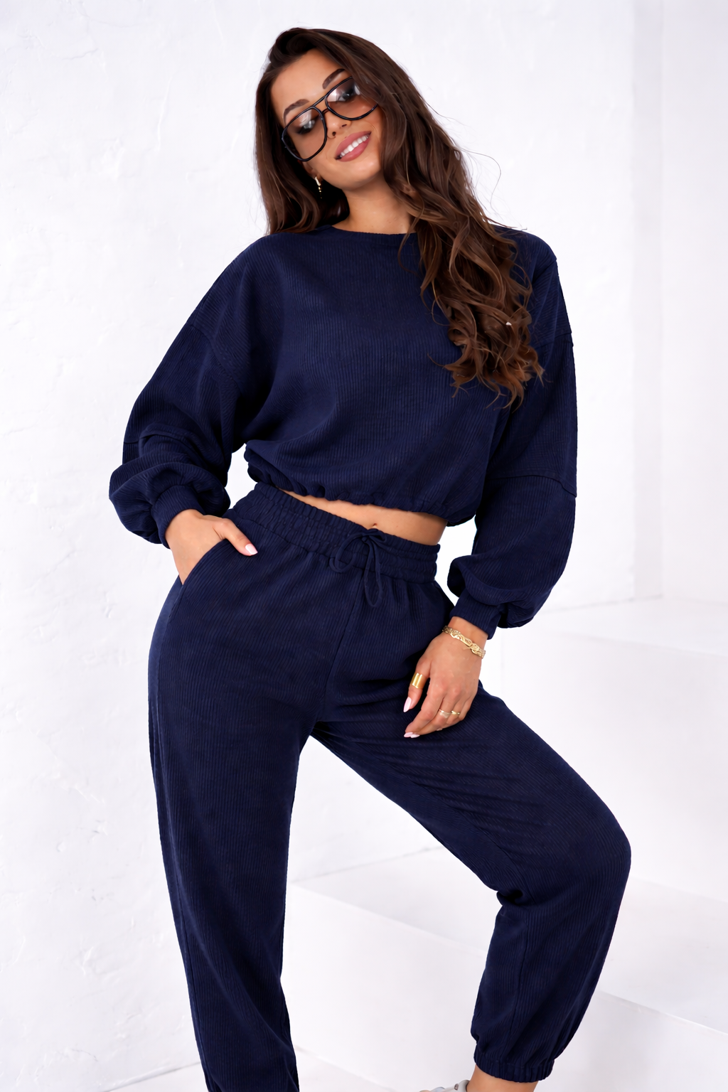 Modny granatowy komplet damski z materiału o strukturze przypominającej sztruks to idealna propozycja dla kobiet, które cenią wygodę i styl w codziennych stylizacjach.