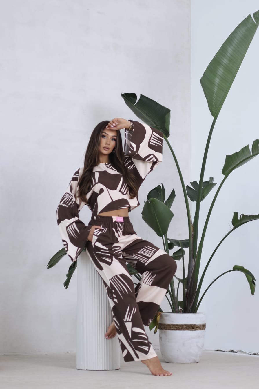- Wzór – modny print w duże liście czekoladowe na beżowym tle.