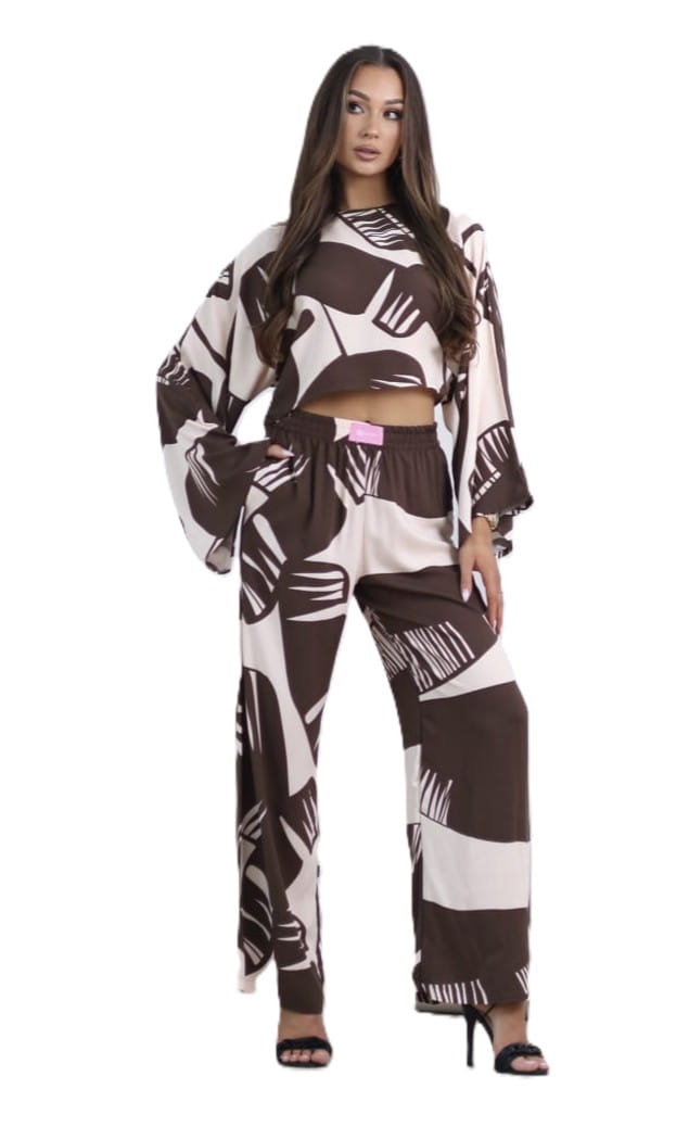 - Bluzka – krótka, o luźnym fasonie, zapewniająca swobodę ruchów. Ma szerokie, długie rękawy w stylu kimono, które dodają elegancji. Dekolt w łódkę subtelnie eksponuje obojczyki, dodając lekkości całej stylizacji.
