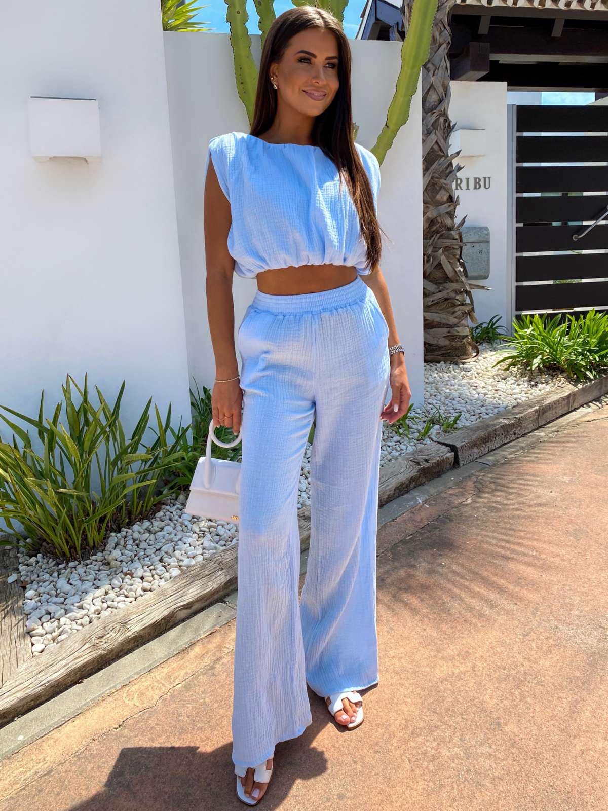 Komplet składa się z bluzki typu crop top i spodni z szerokim nogawkami.