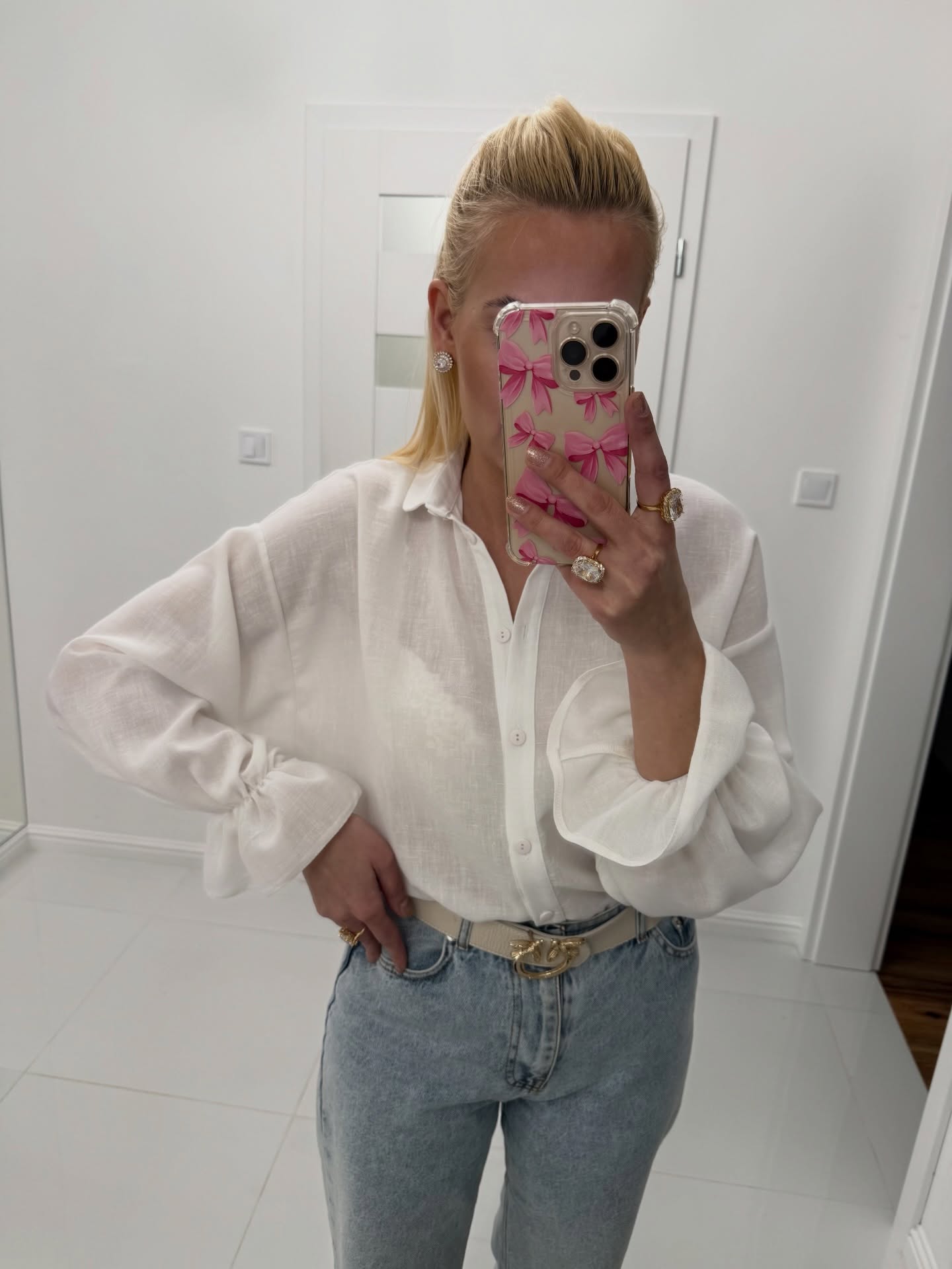 Jej oversize’owy krój z obniżoną linią ramion nadaje stylizacji nonszalanckiego, współczesnego charakteru, jednocześnie zapewniając pełną swobodę ruchów. Subtelnie zaokrąglony kołnierzyk dodaje elegancji, a szerokie rękawy zakończone elastyczną gumką i delikatną falbaną wprowadzają kobiecy, wyrazisty detal.