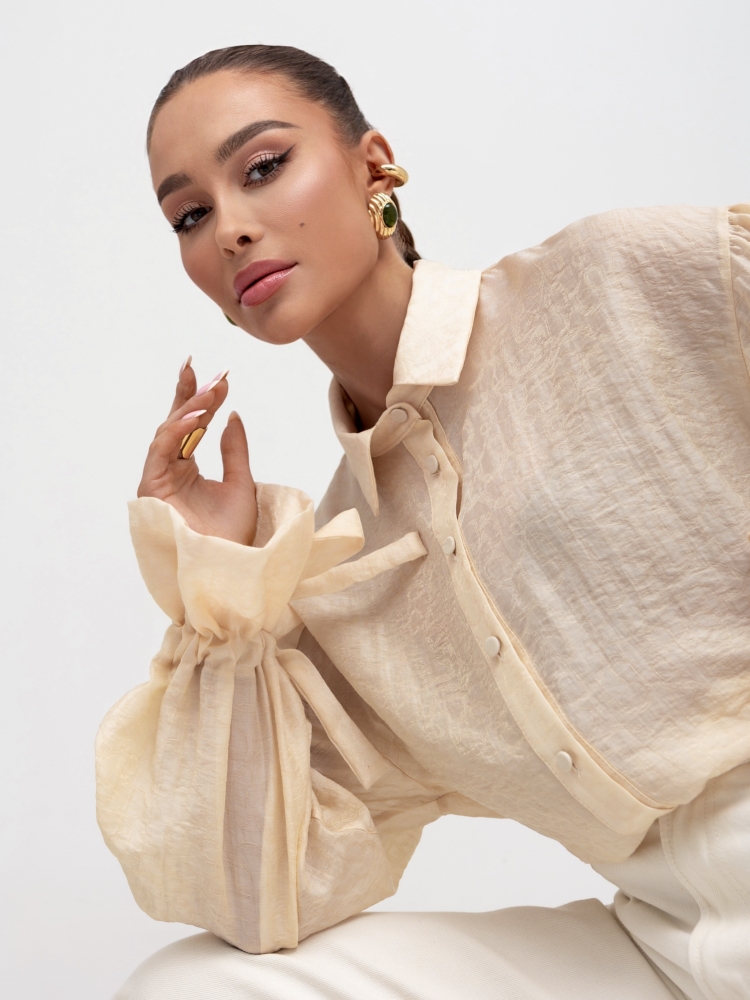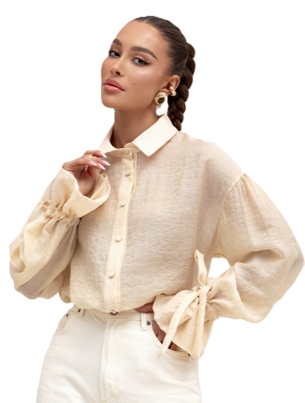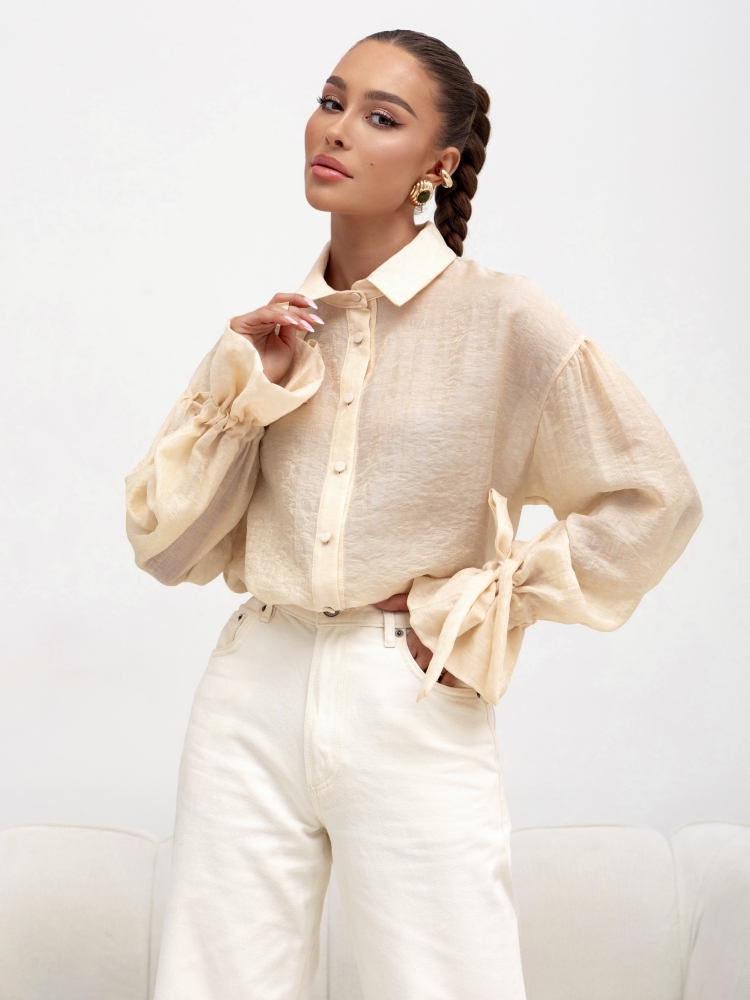 Szerokie rękawy nadają całości lekkości i charakteru, a zakończenia w formie mankietów z możliwością wiązania pozwalają dopasować je do własnych preferencji.