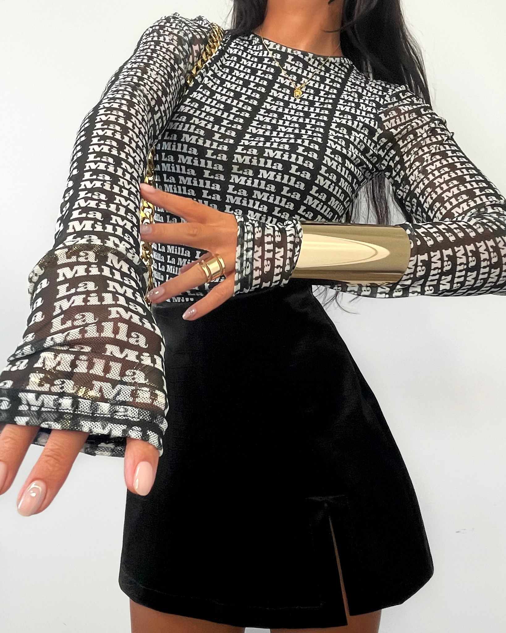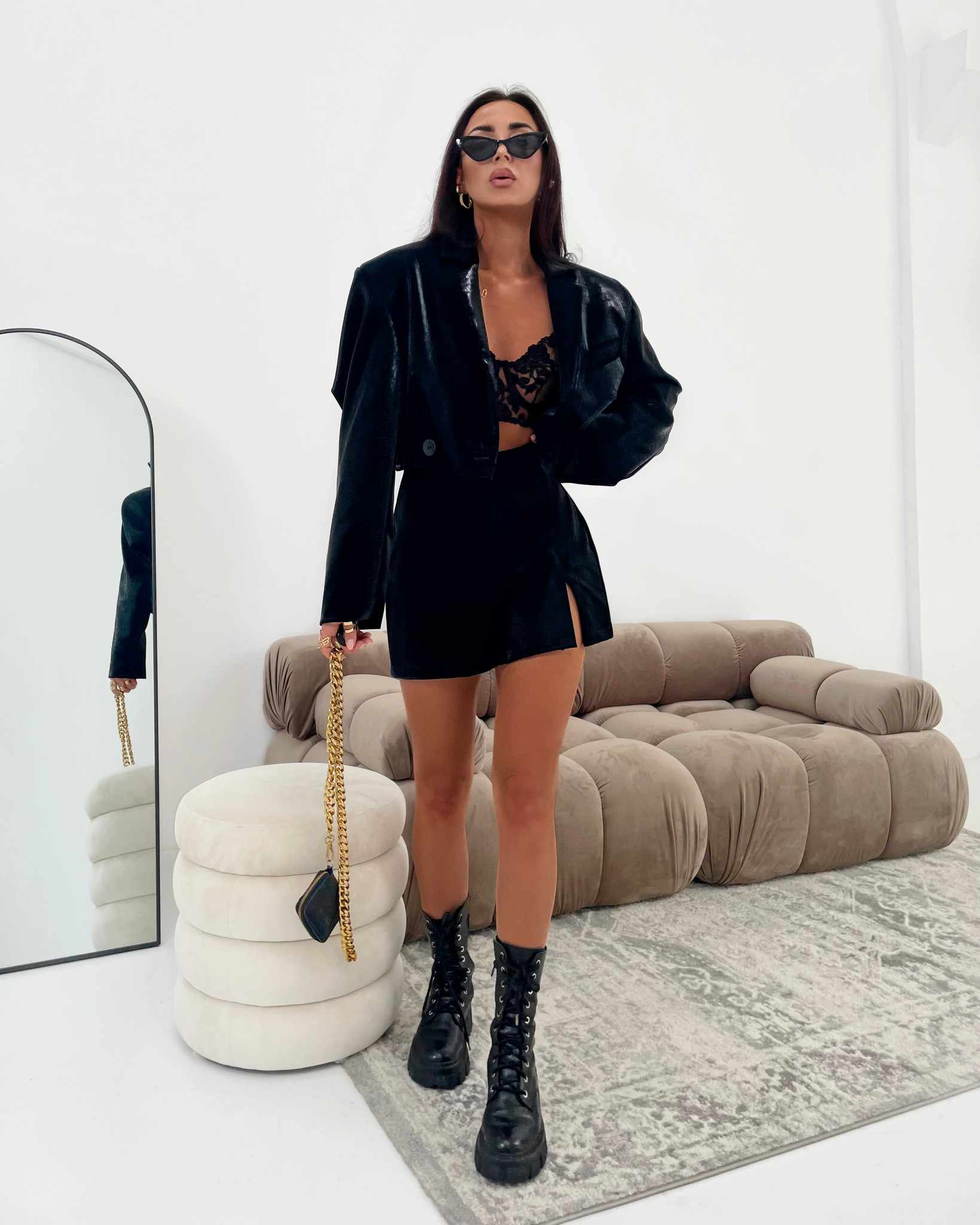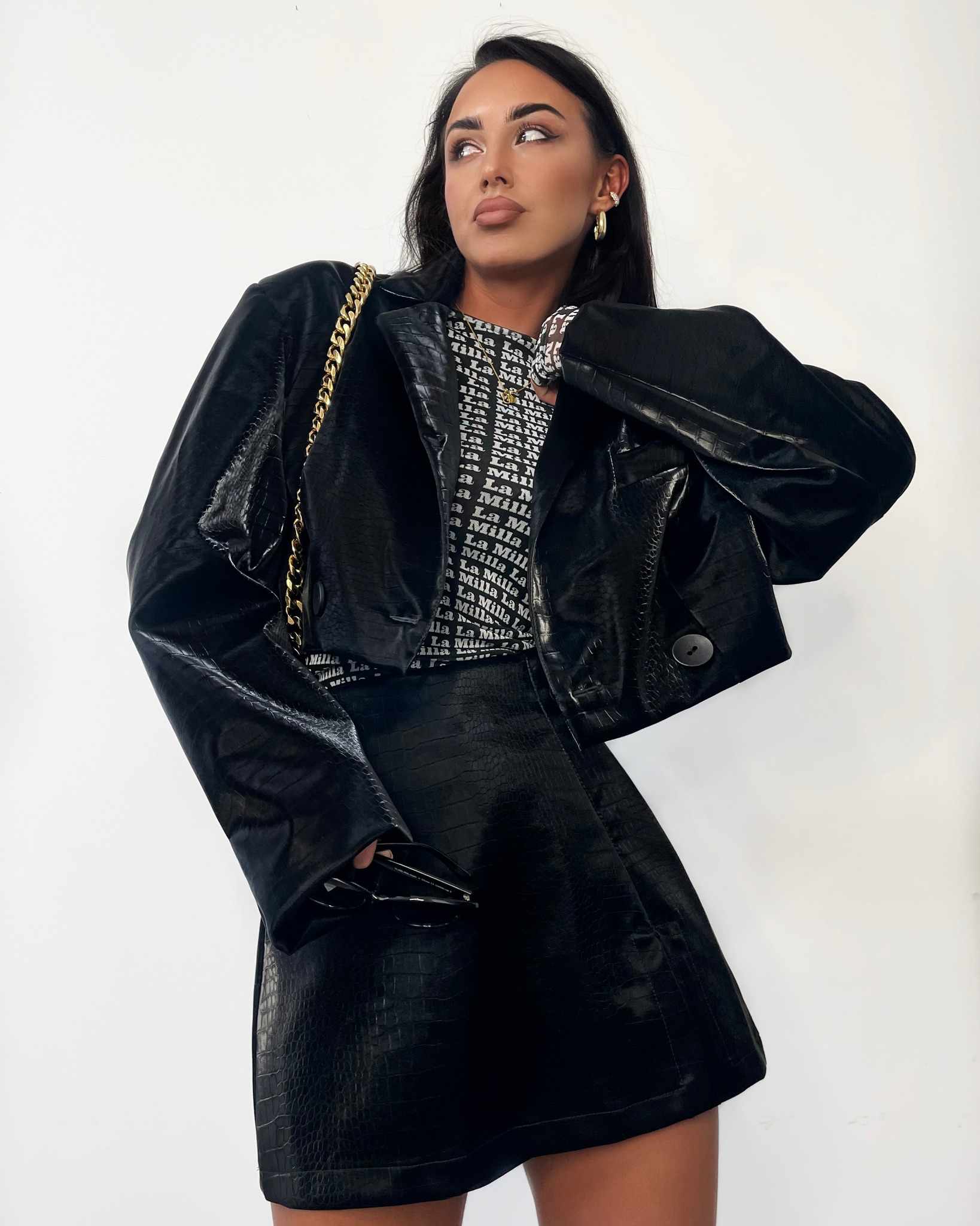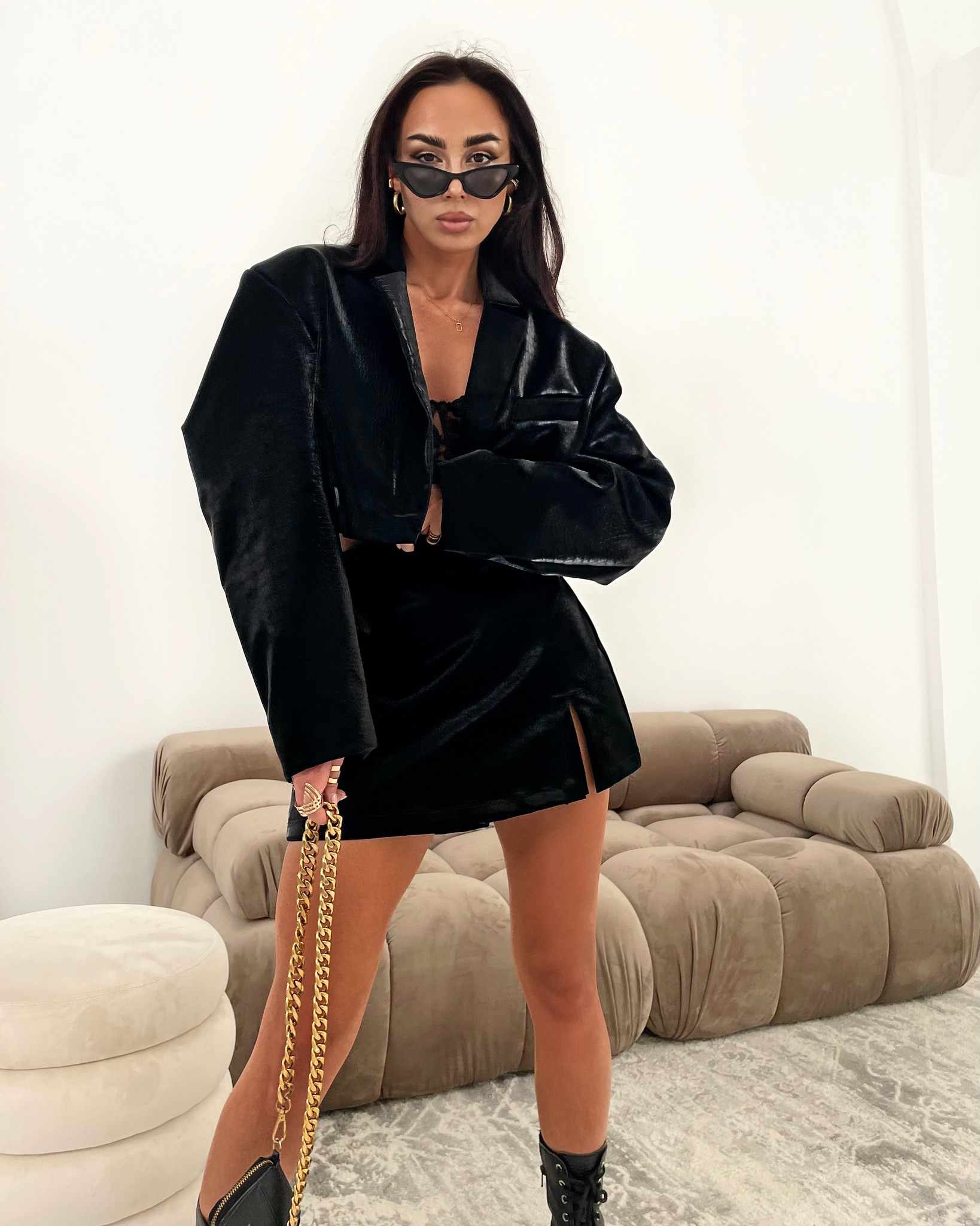Ich czarny kolor oraz połyskująca faktura nadają stylizacji drapieżnego i eleganckiego charakteru.