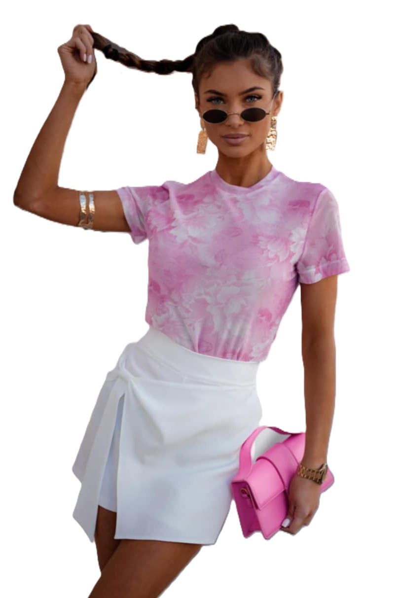 Stylowa bluzka z krótkim rękawem w odcieniach różu, ozdobiona delikatnym wzorem różowo-białych kwiatów.