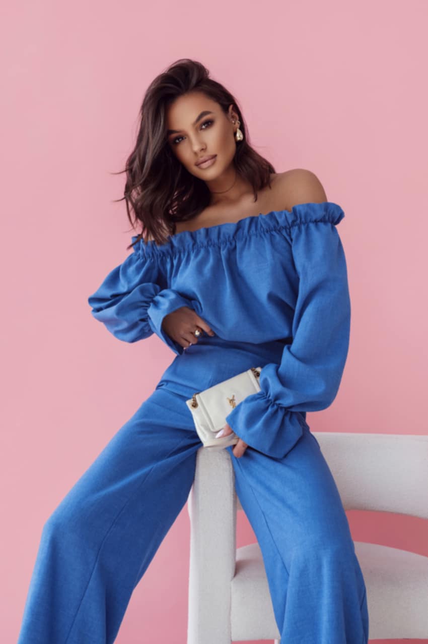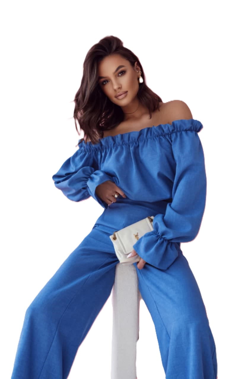 LaBalancia Komplet damski lniany -bluzka hiszpanka+spodnie szerokie niebieski