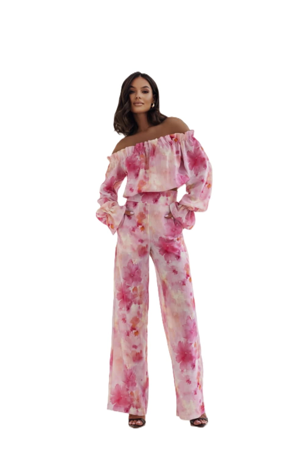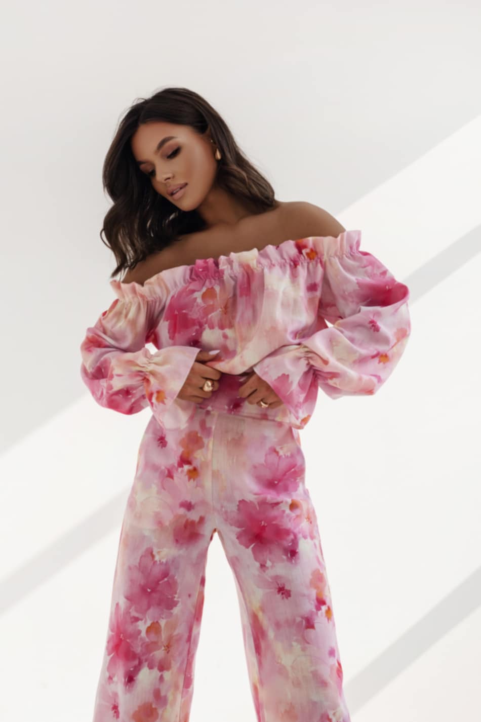 - Kolor i wzór – komplet zachwyca delikatnym, akwarelowym wzorem w odcieniach różu inspirowanym kwiatowymi motywami z dodatkami koloru cytrynowego .Pastelowe kolory sprawiają, że stylizacja nabiera lekkości i elegancji, idealnie komponując się z letnimi dodatkami.
